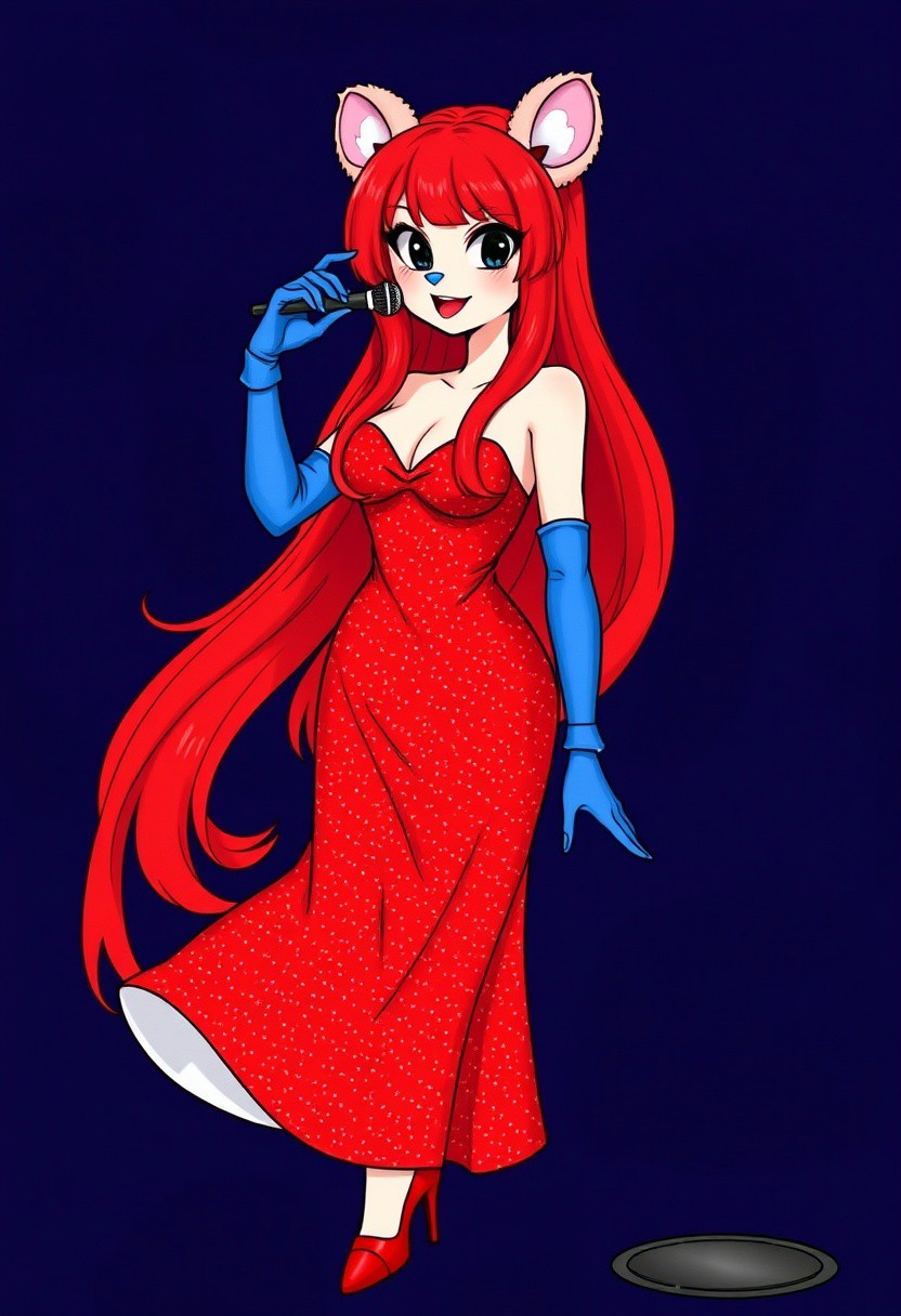 red hair, long hair, red heels, long blue opera gloves, microphone on the side, red sparkly dress, long dress, no sleeves, sleeveless, bear ears, red lipstick, blue nose, medium breasts, dark blue background, black eyes