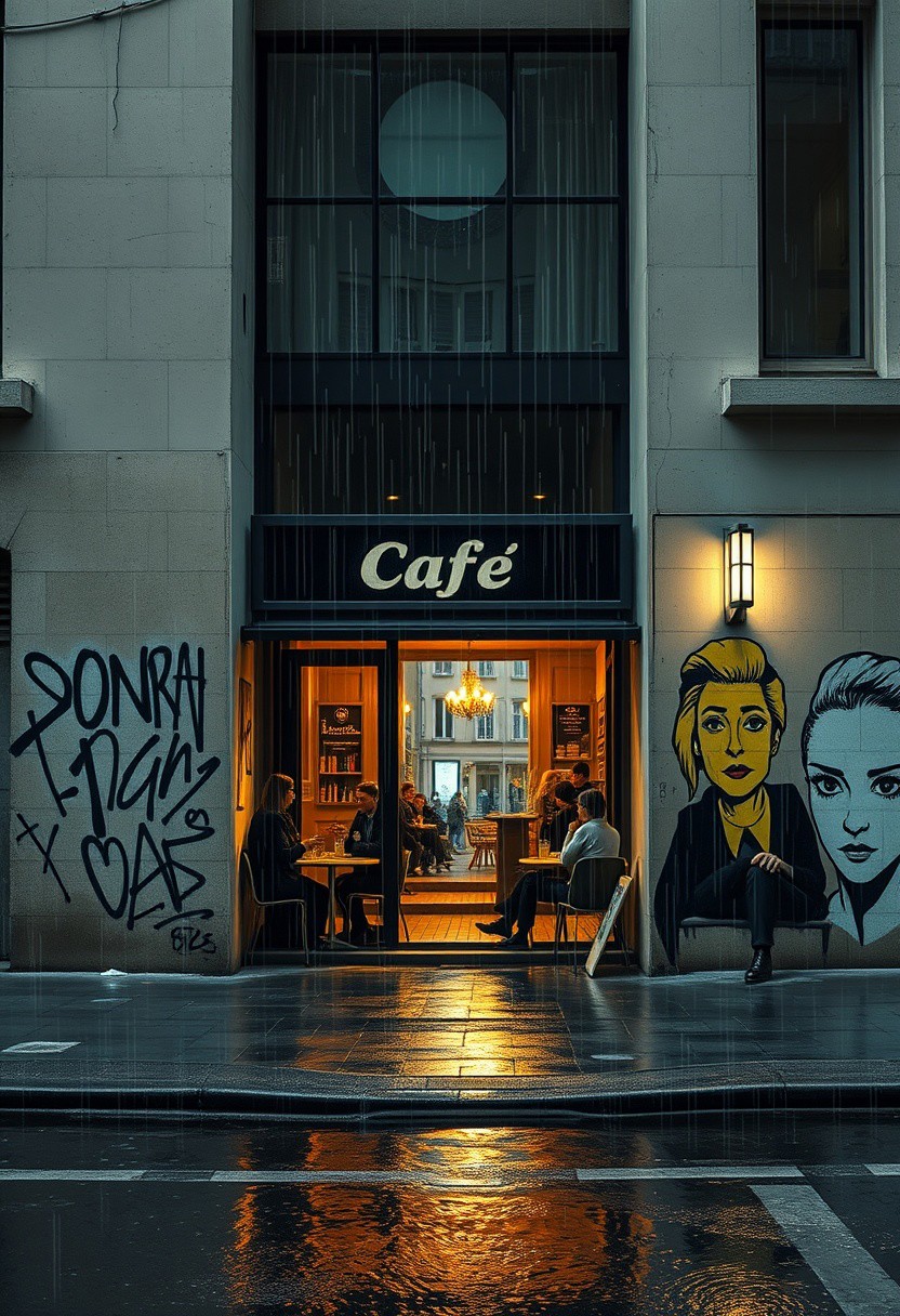 rainy deserted street, entrance to the cafe, people at the tables, cozy evening, hyperrealistic graffiti, modernist minimalism, contemplative figures, urban surrealism, bold composition, muted color palette with graphic accents, stylized realism, narrative symbolism, soft textures contrasted with street art edge, emotional stillness, layered spatial design, fine lines with architectural structure