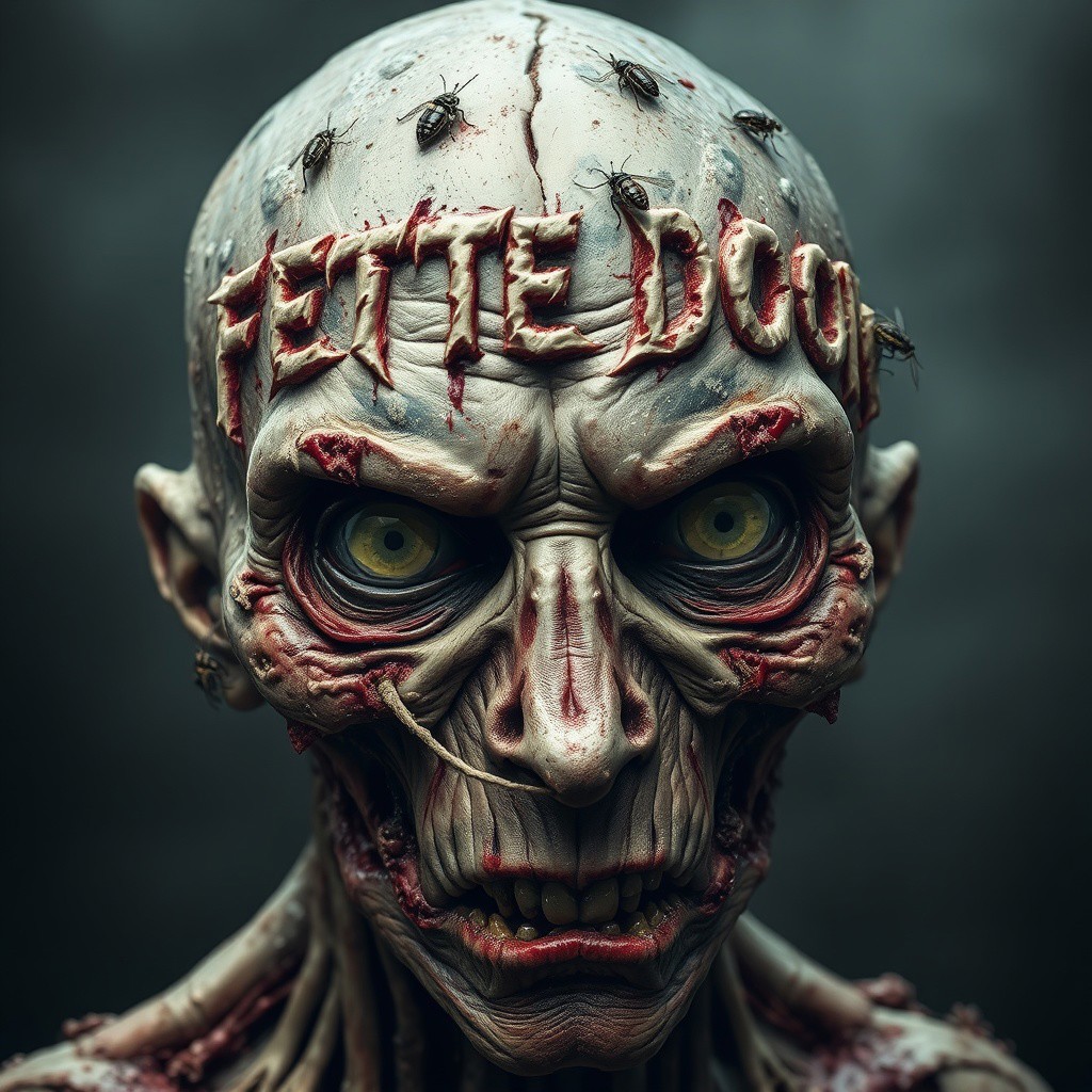 A grotesque death metal album cover titled "FETTE DOOM." The title is carved deep into the decaying, leathery forehead of a zombie, with raw, jagged wounds where the letters have been slashed into the flesh. Blood and pus seep from the carvings, mixing with dirt and grime. The zombie’s skin is mottled, rotting, and stretched tight over bone, with patches of exposed muscle and sinew. Insects crawl in and out of the wounds and eye sockets — flies, maggots, and beetles — adding to the horror. The zombie’s glazed, lifeless eyes stare blankly ahead, while the background is a blur of darkness and mist. The overall tone is brutal, filthy, and unsettling, perfect for an underground death metal vibe.