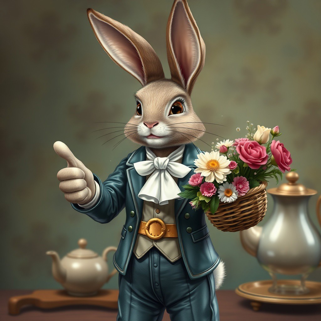 Create a highly detailed, realistic illustration of an anthropomorphic bunny character, inspired by the works of Margaret Brundage. The bunny should be holding a basket of flowers, wearing patent leather, and giving a thumbs up. Incorporate elements of benevolence and whimsy, with a touch of the gaudy and ornate. The character should be depicted in a large, tall format, with a white ascot and a potion belt. Ensure the image is in high definition (4K or 8K) and features micro details, lifelike details, and adherence to the golden ratio. The style should be reminiscent of Mr. Clean and Constantine, with a dash of elegance and sophistication. The output should be a high-quality image, trending on Pinterest, with a top lid and a teapot in the background.