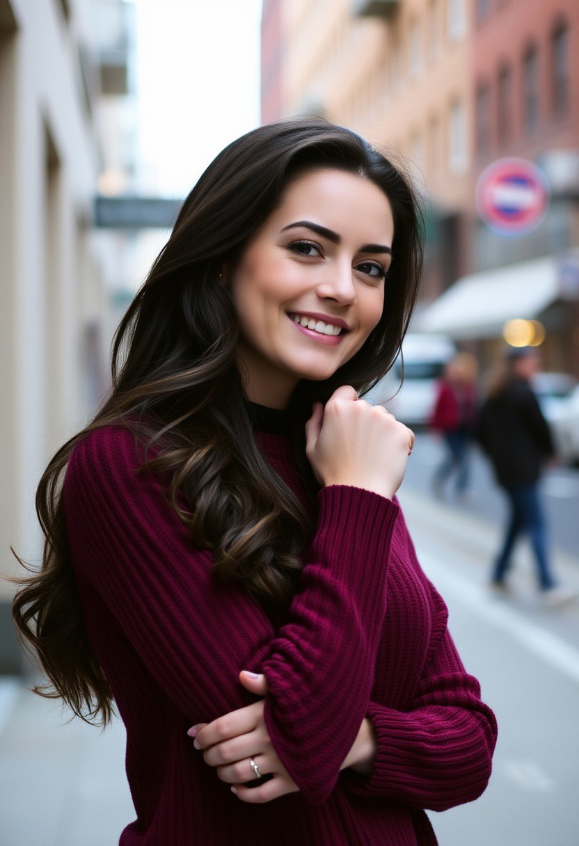 a brunette woman wearing a maroon sweater,she is beautiful,she is smiling in a sexy way, professional photo shoot, urban settings, DSLR, film