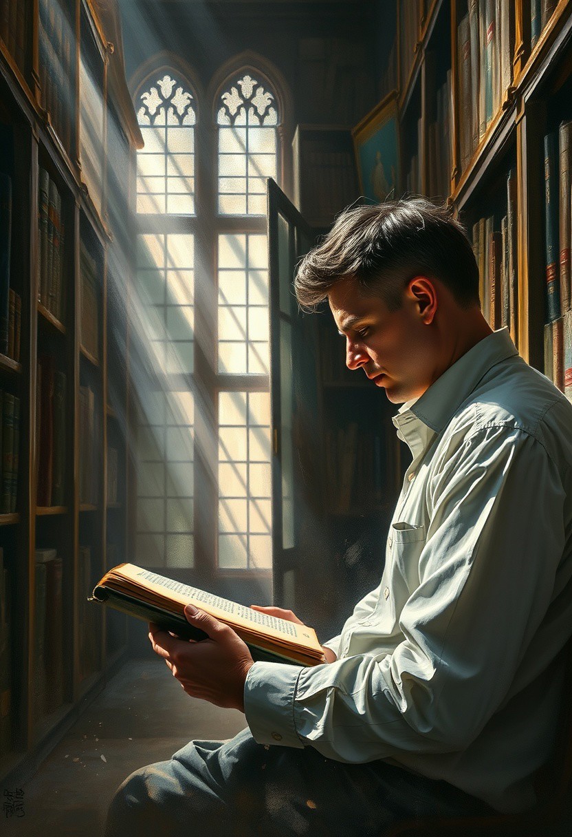 A quiet moment in an old library, where a man studies a weathered book as sunlight filters through dust-filled air romantic realism, expressive impressionism, classical elegance, gestural brushwork, emotional intimacy, soft yet dynamic lighting, refined portraiture, atmospheric settings, painterly textures, narrative-driven scenes, warm color palette, fluid composition, timeless aesthetic