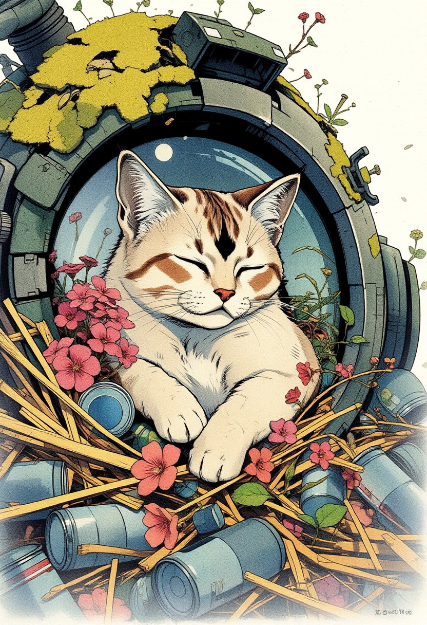 Paint a serene yet dynamic watercolor scene in the Flux art style, where a sleeping cat is *fully nestled within a pile of straw and flowers*. The cat’s body, rendered in soft, muted washes of ash-gray and ivory with a black M in his forehead, is half-buried under a pile of cans, he is inside of a giant destroyed robot eye in an apocalyptic world the robot is cover with moss and plants