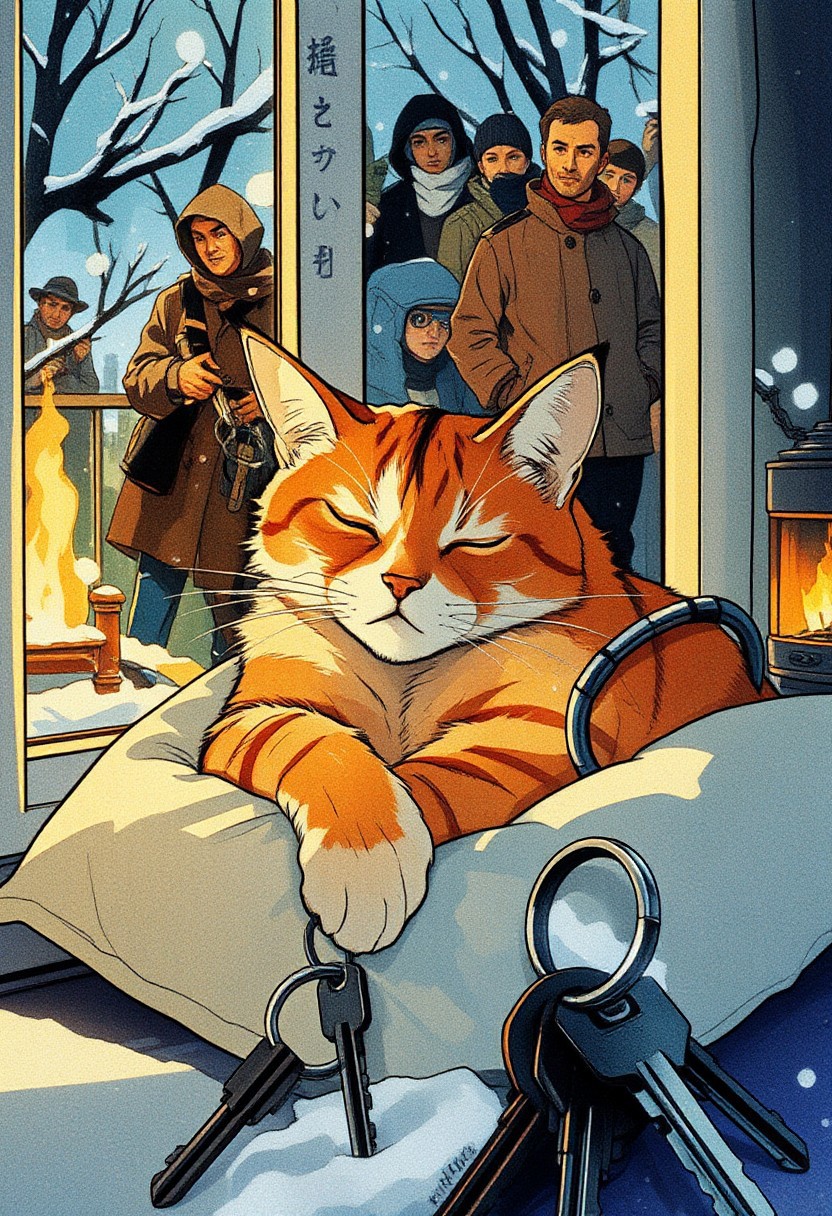 Paint a serene yet dynamic watercolor scene in the Flux art style, where a sleeping cat is *fully nestled within a keys in a keychain*. The cat’s body, rendered in soft, cat color brown with a little orange and a little white with a black M in his forehead, in a soft pillow near to a house window, inside an apartment with a fireplace warm, outside a heavy snowfall a a group of desesperate people in coats freezing hitting on the window trying to get the cat's attention