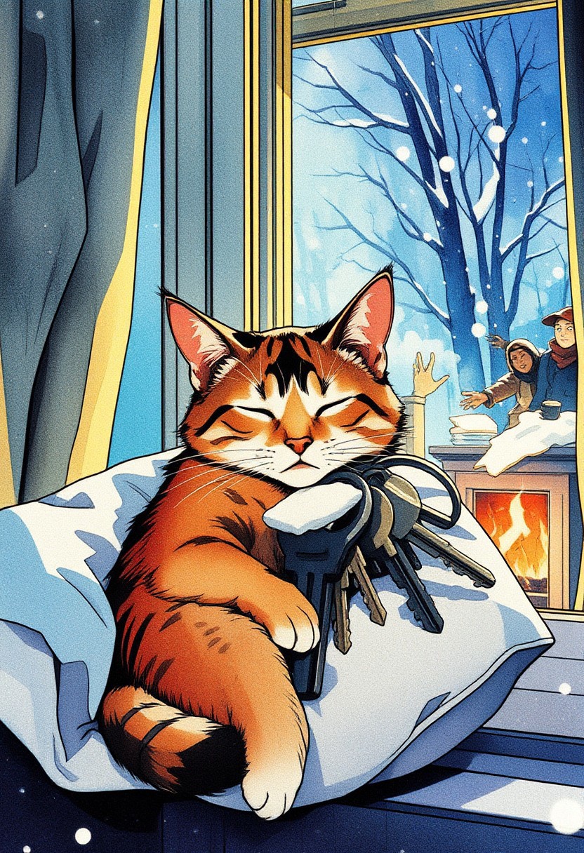 Paint a serene yet dynamic watercolor scene in the Flux art style, where a sleeping cat is *fully nestled within a keys in a keychain*. The cat’s body, rendered in soft, cat color brown with a little orange and a little white with a black M in his forehead, in a soft pillow near to a house window, inside an apartment with a fireplace warm, outside a heavy snowfall a a group of desesperate people in coats freezing hitting on the window trying to get the cat's attention