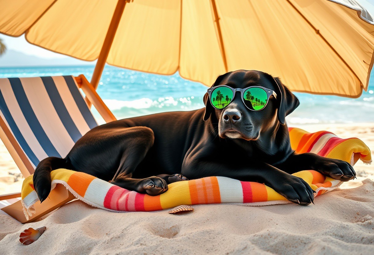 Masterpiece, best quality, highres, cute animal photography style, soft lighting, warm tropical tones, cinematic composition. A black labrador rests peacefully on a striped lounge chair by the shore of a sunny tropical beach. His sleek coat gleams under the soft sunlight, but he's shaded by a wide parasol that casts a gentle, dappled shadow across his body, keeping him cool. The dog lies in a classic curled-up pose, comfortably nestled atop a brightly colored beach towel soft and rumpled beneath his paws. he wears stylish round sunglasses with green lenses, slightly oversized for extra charm. In the reflective tint of the lenses, the sparkling turquoise sea stretches into the horizon, complete with soft white waves and a glimpse of distant palm trees swaying in the breeze. A small breeze tousles his floppy ears just slightly, and there's a half-chewed toy bone nestled beside one paw. the sand beneath the chair is clean and golden, with seashells scattered here and there. A few footprints trail away toward the water. The entire setting radiates peaceful vacation vibes tranquil, tropical, and full of sunshine, with the gentle rhythm of waves completing this serene summer day.