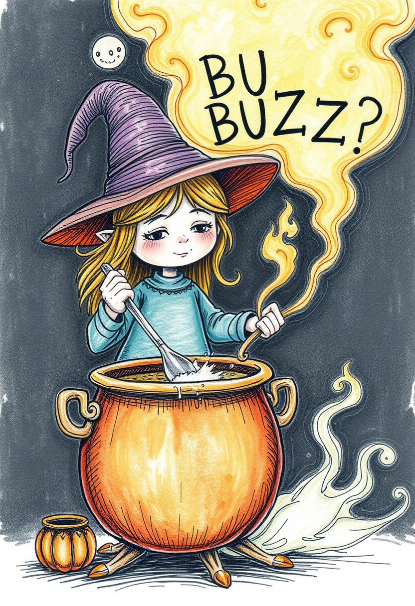 An intricate coloured pencil doodle in the style of Chris Riddell. a cute witch stirring a caldron with a large spoon, the rising steam spells out the word "BUZZ?", cute, whimsical,
