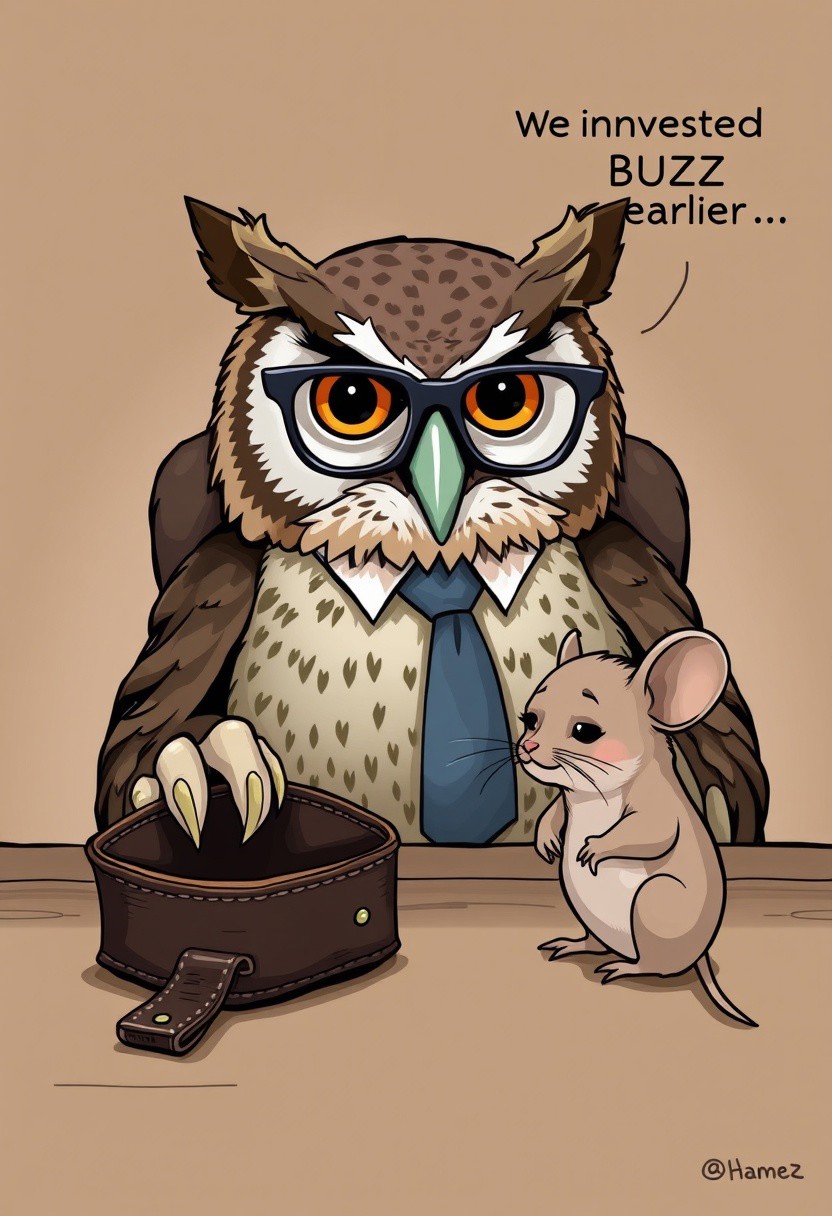 Owl Financial Advisor – A wise-looking owl wearing glasses and a tie sits behind a desk, looking at an empty wallet. He adjusts his glasses and sighs: "You should have invested in BUZZ earlier." A tiny mouse client sitting across from him bursts into tears.