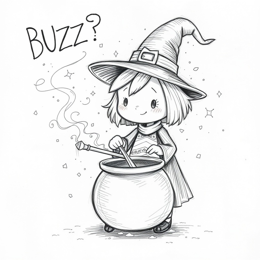 A pencil drawing in the style of Chris Riddell of a cute witch stirring a caldron, the rising steam spells out the word "BUZZ?", cute, whimsical,
