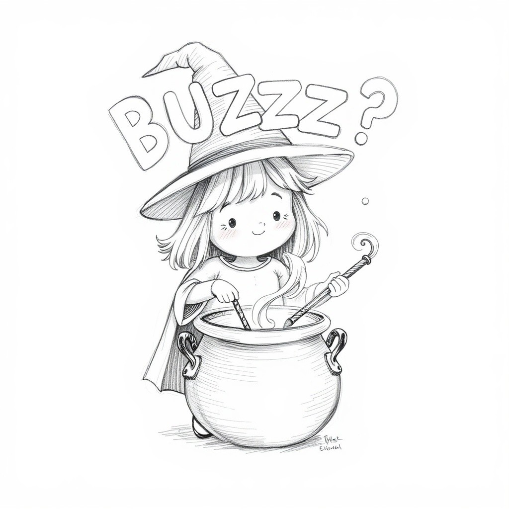 A pencil drawing in the style of Chris Riddell of a cute witch stirring a caldron, the rising steam spells out the word "BUZZ?", cute, whimsical,
