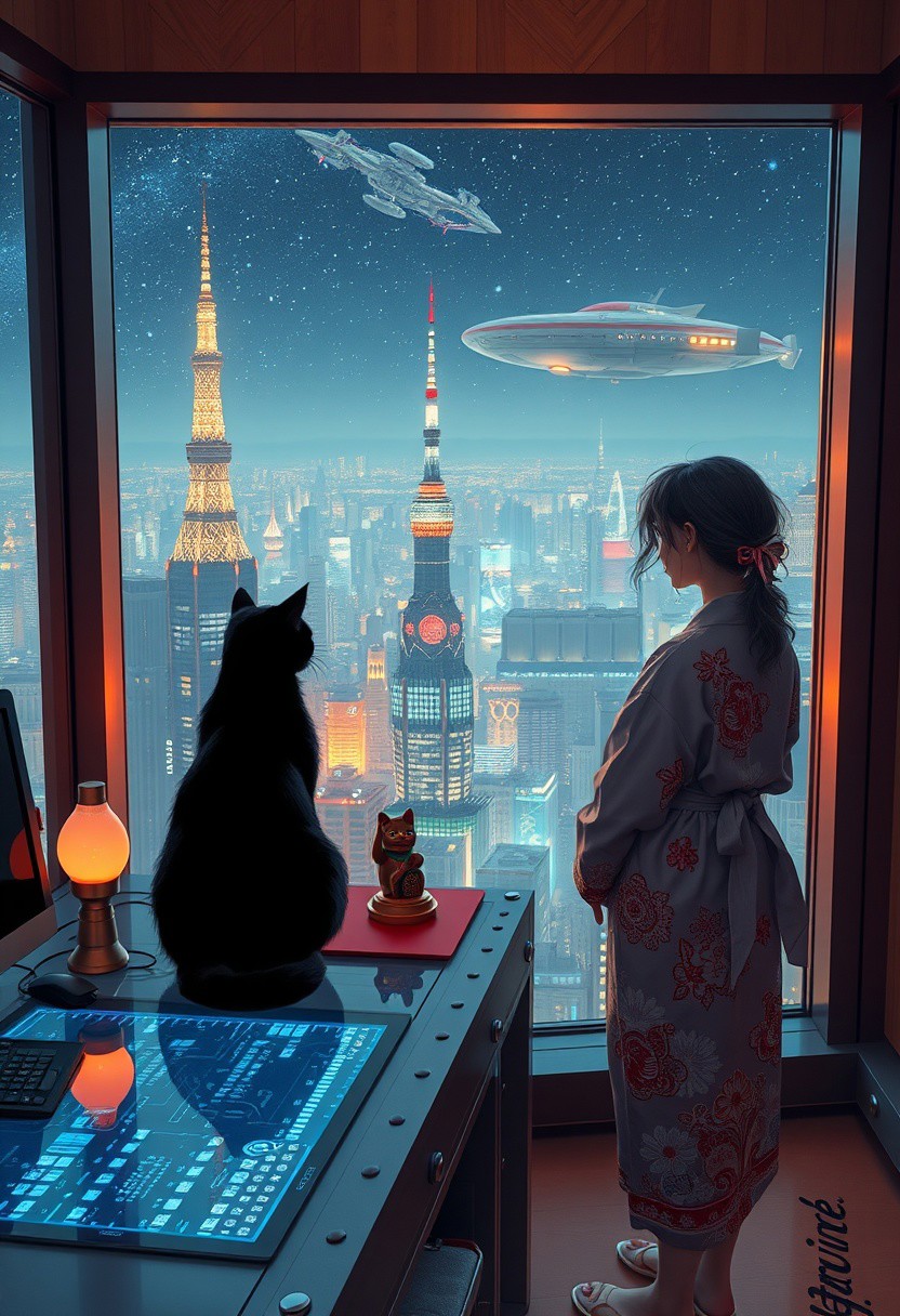 Jiji, the cat from Kiki's Delivery Service sits on a cluttered metal riveted desk with transparent top and rgb led computer components visible inside, On the desk are a maneki neko statue and a lava lamp, Jiji the Black Cat is looking out of a seamless and futuristic floor to ceiling window that looks out at a very high view from an apartment on the 400th floor of a futuristic Tokyo skyscraper, the year is 2250, The city has thousands of enormous wide and tall futuristic skyscrapers and space ships covered with lights in the sky, (((Kiki from Kiki's Delivery Service, 24 years old, is standing next to the cat looking out at the enormous city at night, filled with buildings of many shapes and sizes, some over a mile tall))), Kiki is dressed in an ornate Japanese style bath robe. An enormous deco starship with futuristic lighting and design is visible high above the city, and a space station is visible in the background among the stars, The woman's hair is messy from just waking up and tied up with a ribbon. Artistic cyberpunk, dynamic perspective, The focus is on Jiji and Kiki standing together looking out the window at the view together, (((overall architectural aesthetic is Art Deco Cyberpunk))). Mt Fuji can be seen in the far distance,