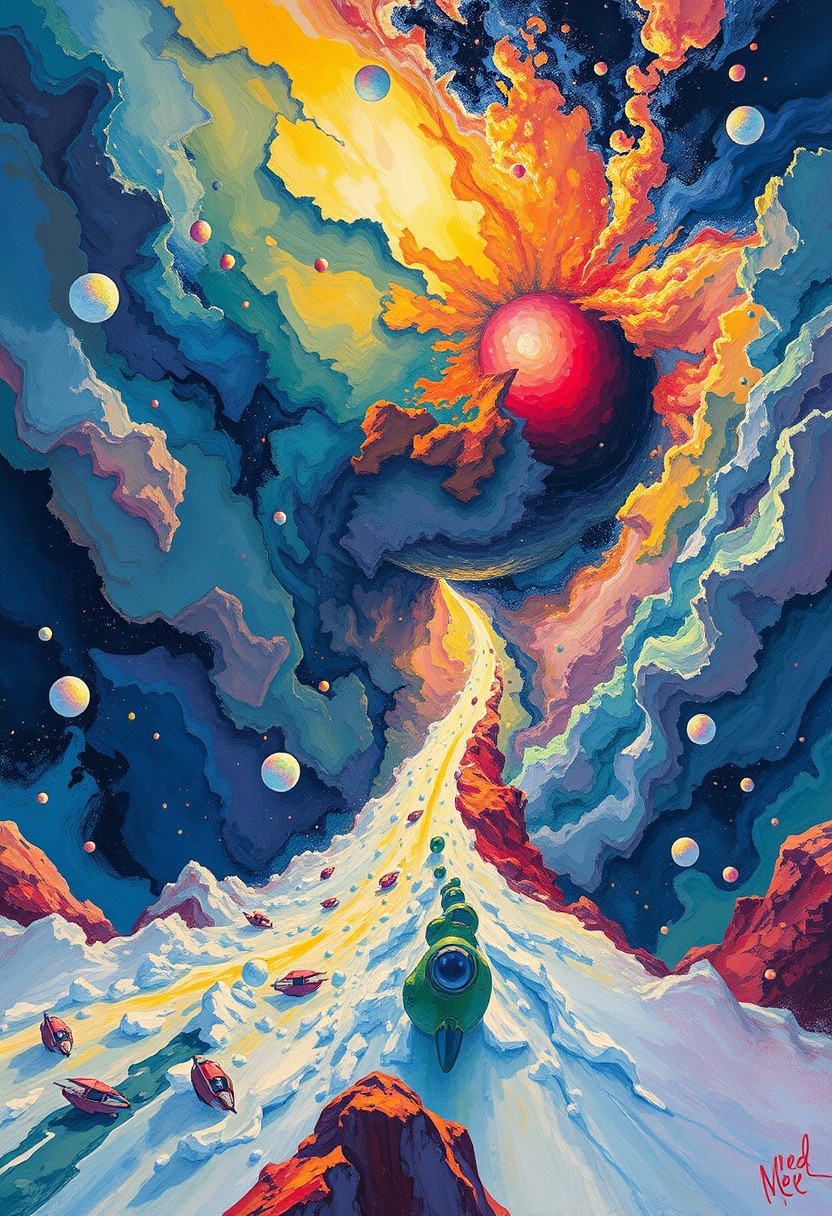 gouache painting about In the unpublished and breathtaking image far beyond the unseeable by syd mead, the essence of the Master's artistry shines through with remarkable clarity. As your eyes wander across the canvas, you'll encounter a harmonious fusion of elements that defy convention and ignite the imagination. It is a visual symphony that stands as a testament to meads boundless creativity. Vibrant and sublime colors dominate the image, bursting forth with a luminosity that captivates the viewer.,