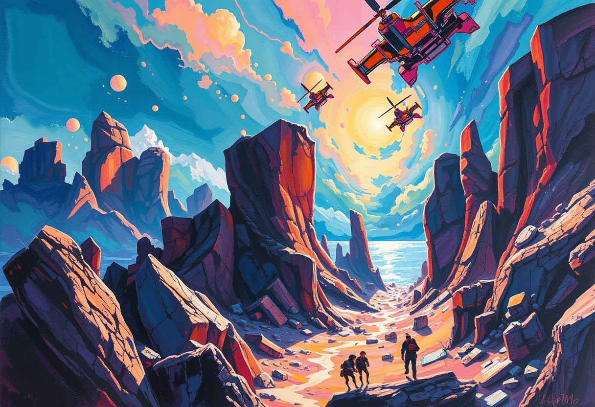 gouache painting about In the unpublished and breathtaking image far beyond the unseeable by syd mead, the essence of the Master's artistry shines through with remarkable clarity. As your eyes wander across the canvas, you'll encounter a harmonious fusion of elements that defy convention and ignite the imagination. It is a visual symphony that stands as a testament to meads boundless creativity. Vibrant and sublime colors dominate the image, bursting forth with a luminosity that captivates the viewer.,