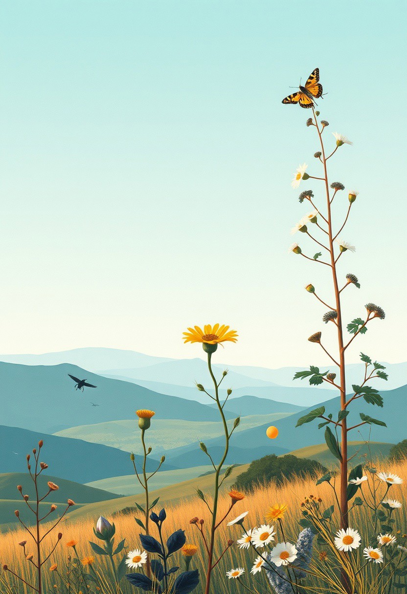 A bold, naturalist illustration, stylized landscape composition, high realism detail, simplified geometric forms, luminous cool tones, precise rendering of flora and fauna, minimalist background, spiritual atmosphere, botanical and entomological studies, bold horizon lines, soft gradients, scientific observation, still life with symbolic depth, serene color fields, elevated perspective, fusion of baroque realism and Canadian modernism, elevated nature study, quiet reverence