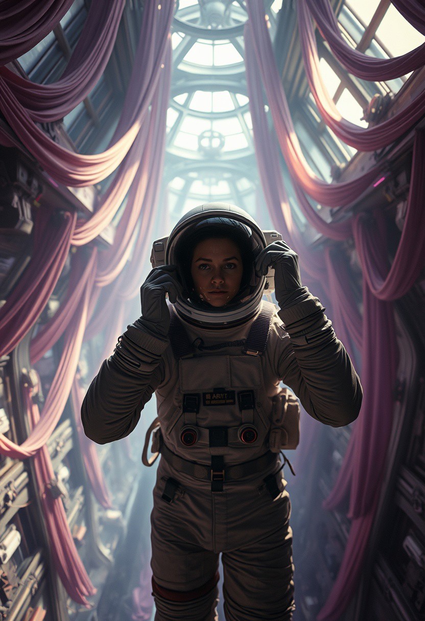 A lone astronaut with a 1950s film star face removes their helmet inside a cathedral-like orbital station, light and shadow wrapping them like fabric., bending space, zPDXL , graceful ribbons, chiaroscuro effect, chaos and vibrancy, gravity-defying architecture, dramatic lighting None, and purple, Post-Apocalyptic undertones, whimsical