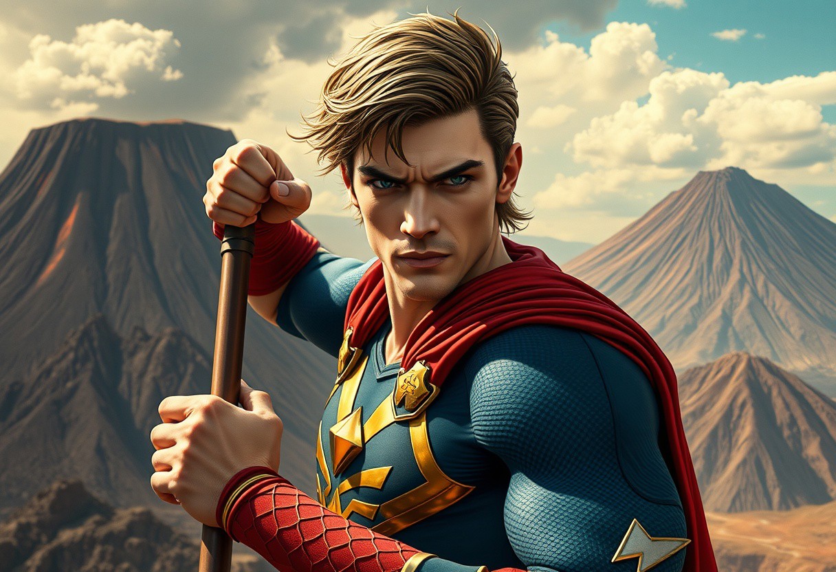 Create a highly detailed, lifelike image of Comics Hero Legend Arthur in a superhero pose, with a dormant volcano background. The image should be inspired by the styles of Nara Yoshitomo, Artgerm, Greg Rutkowski, and Alphonse Mucha. The technical specifications are: 8k resolution, cinematic, full width, no watermark signature, and a golden ratio composition. The subject should have a fair complexion, with a focus on fine details and intricate shading. The style should be a blend of sci-fi and cyberpunk elements, with a sense of elegance and refinement. The image should be created with a Canon 2.0 mm lens and inspired by the works of Nam June Paik.