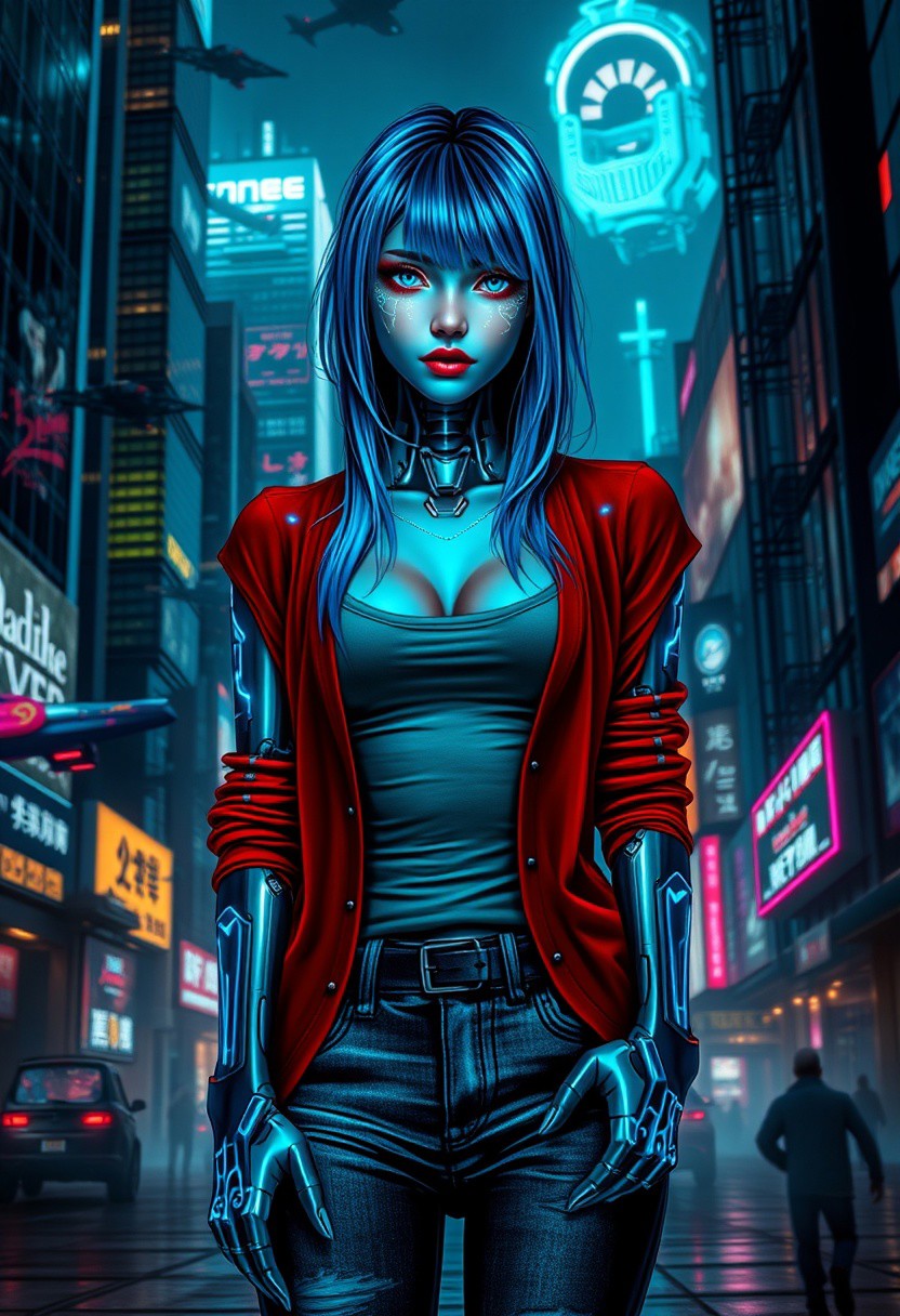 A stunning female cyborg with vibrant blue hair standing in a neon-lit futuristic city at night. She has sleek metallic skin with glowing blue circuits tracing along her arms and face. Her cybernetic eyes emit a soft luminescent glow. She wears a stylish red cardigan over a fitted top and blue jeans, blending casual fashion with advanced technology. The background is filled with towering skyscrapers, flying vehicles, and vibrant holographic advertisements, creating a cyberpunk atmosphere. The overall mood is a mix of mystery and allure, combining futuristic aesthetics with a touch of everyday style
