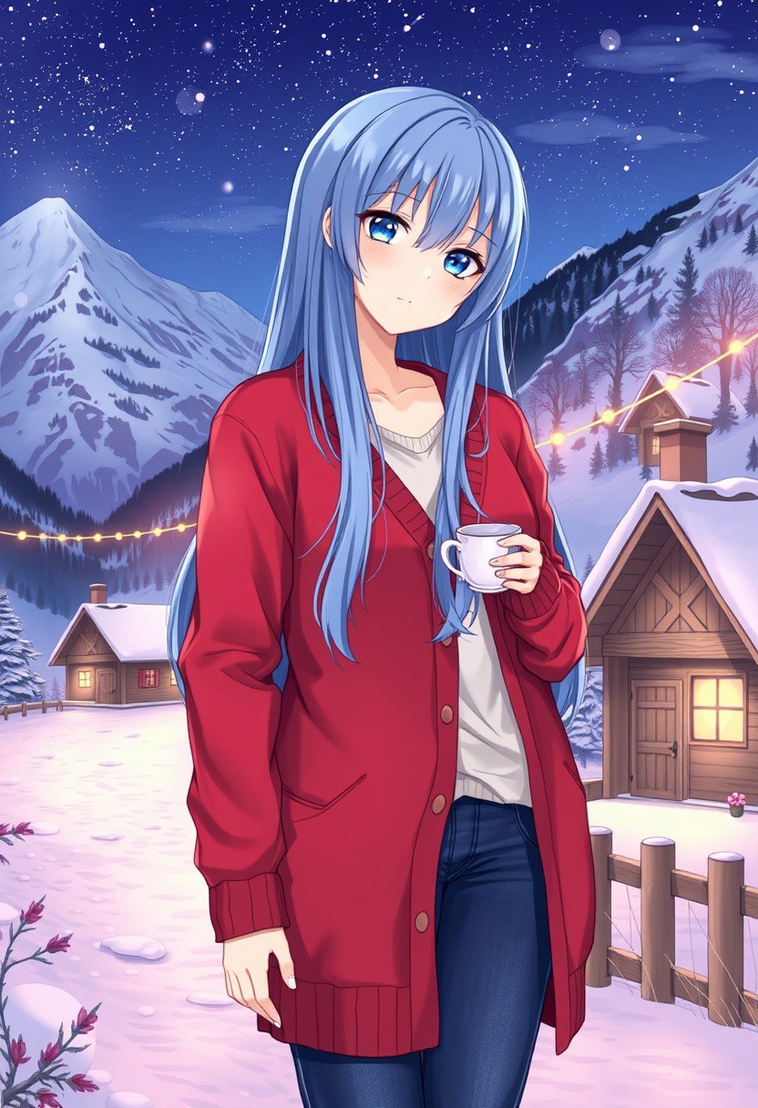 1girl,blue hair,long hair,red cardigan,blue jeans, standing, mountain,snow,near cottages,night time,lamps,tea in hand,