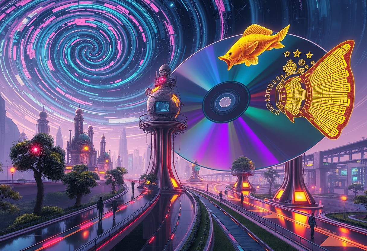 A floating neon city built entirely from giant CDs, reflecting a swirling cosmic sky. Towering mechanical trees with glowing circuits replace natural vegetation. Strange creatures with televisions for heads walk along gravity-defying roads, while a massive, golden fish hovers mid-air, its fins transforming into delicate fractals. The atmosphere is a mix of cyberpunk and dreamlike fantasy, with soft vaporwave lighting casting eerie yet beautiful reflections