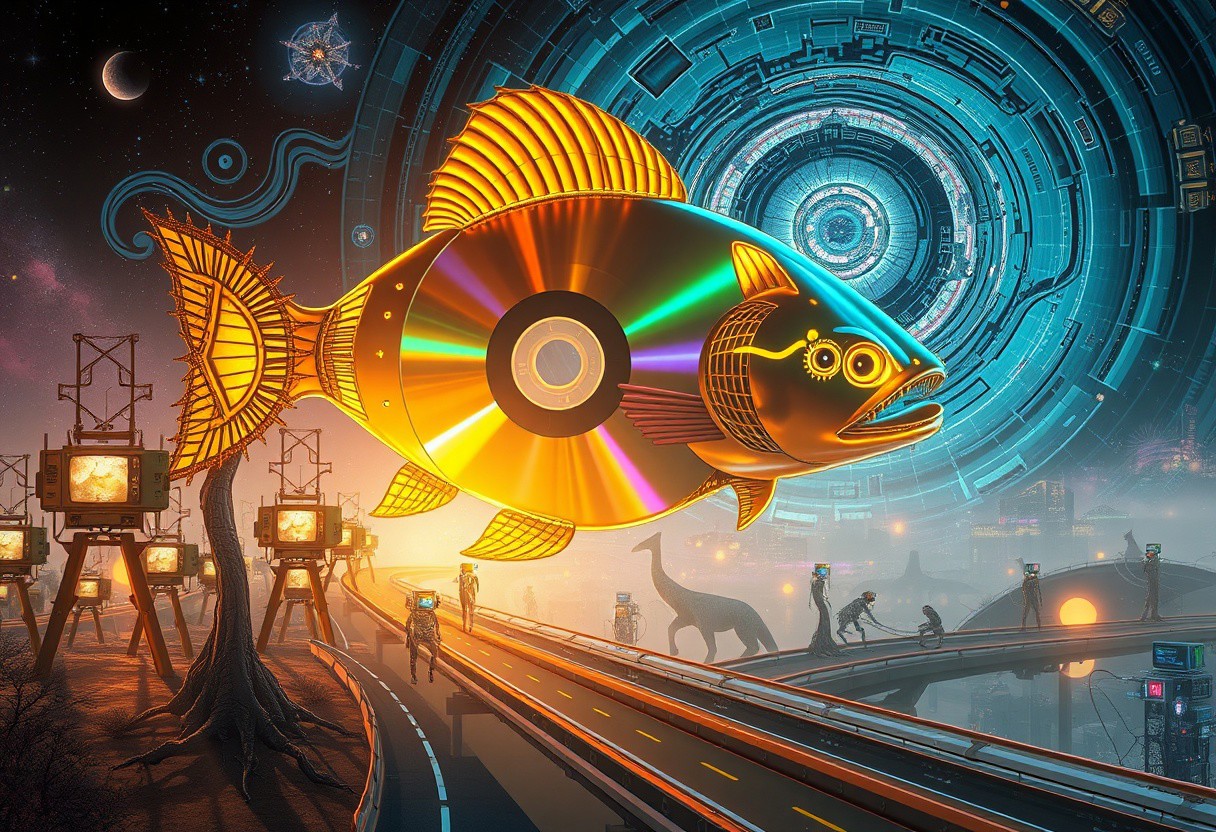 A floating neon city built entirely from giant CDs, reflecting a swirling cosmic sky. Towering mechanical trees with glowing circuits replace natural vegetation. Strange creatures with televisions for heads walk along gravity-defying roads, while a massive, golden fish hovers mid-air, its fins transforming into delicate fractals. The atmosphere is a mix of cyberpunk and dreamlike fantasy, with soft vaporwave lighting casting eerie yet beautiful reflections