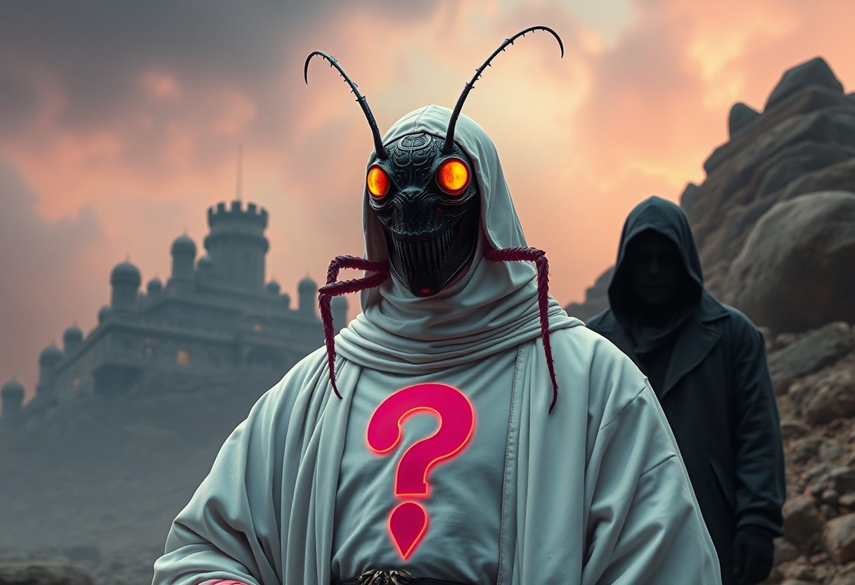 Create a high-definition, photorealistic artwork of a Cockroach Knight with a question mark on its chest, inspired by the styles of Kazuo Umezu and Frank Frazetta. The knight should be wearing a white robe with dayglo pink accents and be set against a backdrop that incorporates elements of Iram of the Pillars and Jorogumo. Include a mysterious, featureless stranger in the scene, with a creepy, gothic-inspired aesthetic. The artwork should adhere to the golden ratio and have a psychedelic, overcast tint. Ensure that the piece is highly detailed, with a focus on micro details and lifelike textures. The color palette should be vibrant and cinematic, with a mix of realistic and fantastical elements. The final piece should be reminiscent of the works of Dorothea Tanning, Magali Villeneuve, and Artgerm, with a strong emphasis on anthropology and wonder.