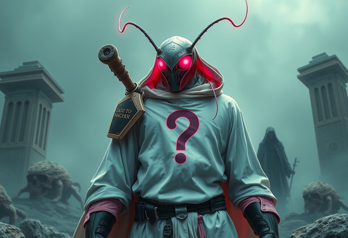 Create a high-definition, photorealistic artwork of a Cockroach Knight with a question mark on its chest, inspired by the styles of Kazuo Umezu and Frank Frazetta. The knight should be wearing a white robe with dayglo pink accents and be set against a backdrop that incorporates elements of Iram of the Pillars and Jorogumo. Include a mysterious, featureless stranger in the scene, with a creepy, gothic-inspired aesthetic. The artwork should adhere to the golden ratio and have a psychedelic, overcast tint. Ensure that the piece is highly detailed, with a focus on micro details and lifelike textures. The color palette should be vibrant and cinematic, with a mix of realistic and fantastical elements. The final piece should be reminiscent of the works of Dorothea Tanning, Magali Villeneuve, and Artgerm, with a strong emphasis on anthropology and wonder.