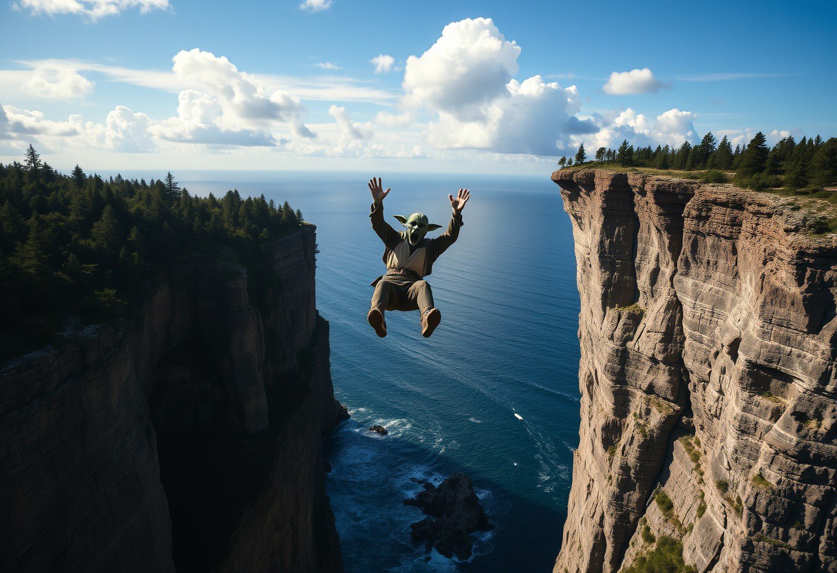 realistic, complex shadows, intricate details, high quality, hi res, best quality, beautiful, BREAK jar jar binks, screaming, jar jar binks falling off a cliff, flailing arms, view from a distance, 50 meters away, far away, forest, cliff face, ocean, sharp rocks at bottom of cliff, blue sky, clouds, vivid colours, high contrast,