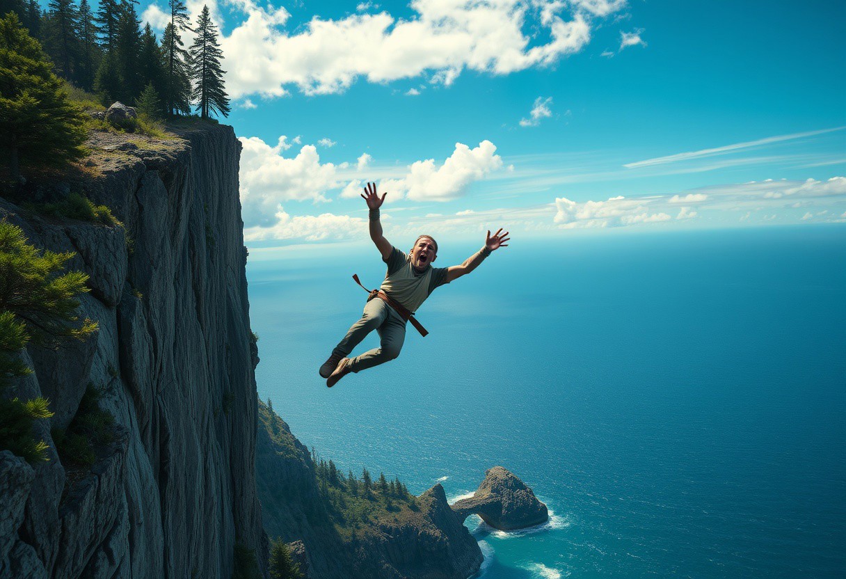 realistic, complex shadows, intricate details, high quality, hi res, best quality, beautiful, BREAK jar jar binks, screaming, jar jar binks falling off a cliff, flailing arms, view from a distance, 50 meters away, far away, forest, cliff face, ocean, sharp rocks at bottom of cliff, blue sky, clouds, vivid colours, high contrast,