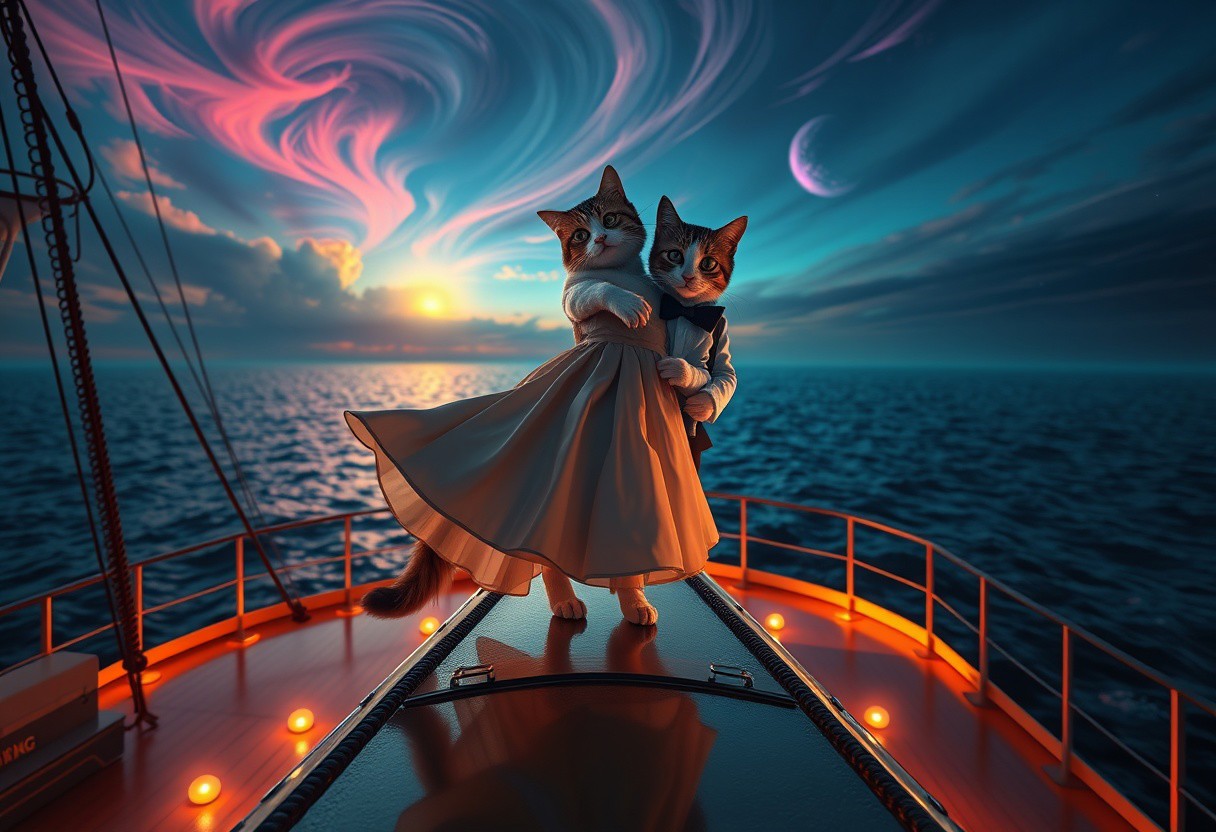 A highly detailed and humorous recreation of the iconic *Titanic* scene, but with two anthropomorphic cats on the bow of the ship. One cat, wearing a flowing dress, stands at the edge with its paws outstretched, embracing the wind and open sea. Behind it, another cat in a tuxedo gently holds its waist, gazing at it with admiration. The vast ocean stretches endlessly in the background, reflecting a breathtaking neon sunset. The ship’s deck glows with warm, cinematic lighting, showcasing intricate vintage nautical details. The perspective is exaggerated, enhancing the whimsical, surreal effect. The sky swirls with psychedelic colors, and the ocean waves shimmer with vibrant, dreamlike hues. Created using: cinematic lighting, hyper-realistic textures, vibrant neon highlights, artistic composition, atmospheric depth, detailed feline expressions, oceanic reflections, vintage ship aesthetics, Highly reminiscent of the iconic titanic bow scene with the ship body in the background and the bow in the foreground,