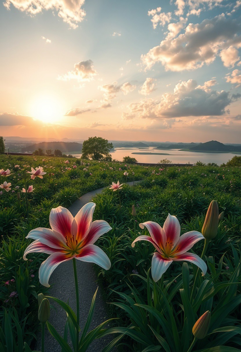 detailed background, from above,( Calm spring night landscape), amongst lush greenery, beautiful view, Flower Field, lily flower in full bloom, lily flower, early morning, sunrise sky, beautiful clouds, dappled sunlight, beautiful, Tranquil Lake, Walkway, petals dancing in the wind, depth of field, masterpiece, best quality, ultra-detailed, very aesthetic, illustration, perfect composition, intricate details, absurdres, moody lighting, wisps of light, no humans,