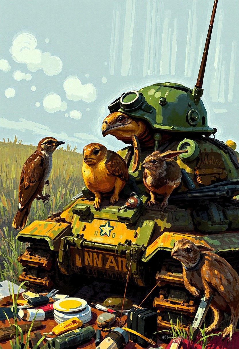 round brush drawing, intensifying made of tortoise in a derisive, misconceives, churning butter, late afternoon, with a military 50s helmet, with tank parts in his shell fighting in WWII with birds with plane parts, rabbits with train parts and moles with scavenger parts