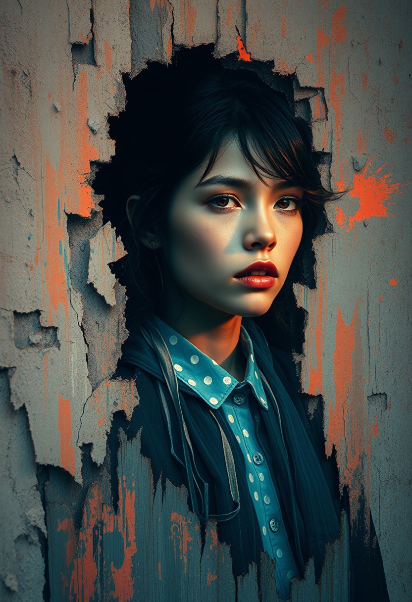 The Echoes of Time , faded portrait emerging from a layered, weathered wall, soft glowing orange and pink hues blending into deep blues, fragmented brushstrokes evoking memories dissolving into abstraction, historical photographic technique, innocence and longing, desolate urban landscape, dark, chaos and vibrancy, high-fashion attire, expressive portraiture, sculptural reimagining, very detailed, dramatic lighting