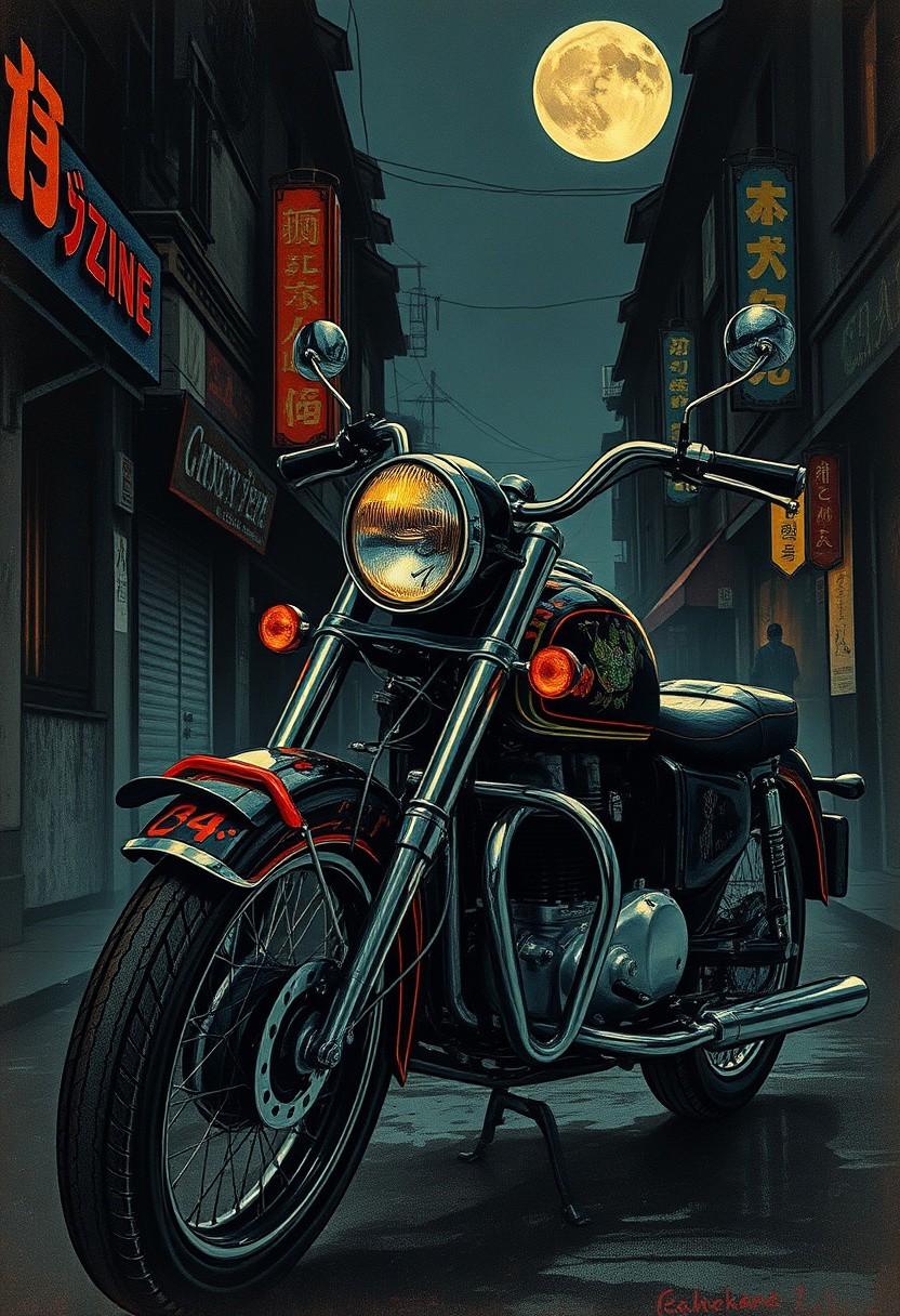 A vintage motorcycle with elegant floral engravings, vintage pulp illustration, japanese gothic mystery, noir suspense, psychological horror, moody atmosphere, chiaroscuro lighting, dramatic composition, sinister elegance, retro book cover art, twisted narratives, 1950s pulp realism, uncanny characters, surreal menace, textured brushwork, vivid expressionism, dark eroticism, theatrical poses, gothic urban settings