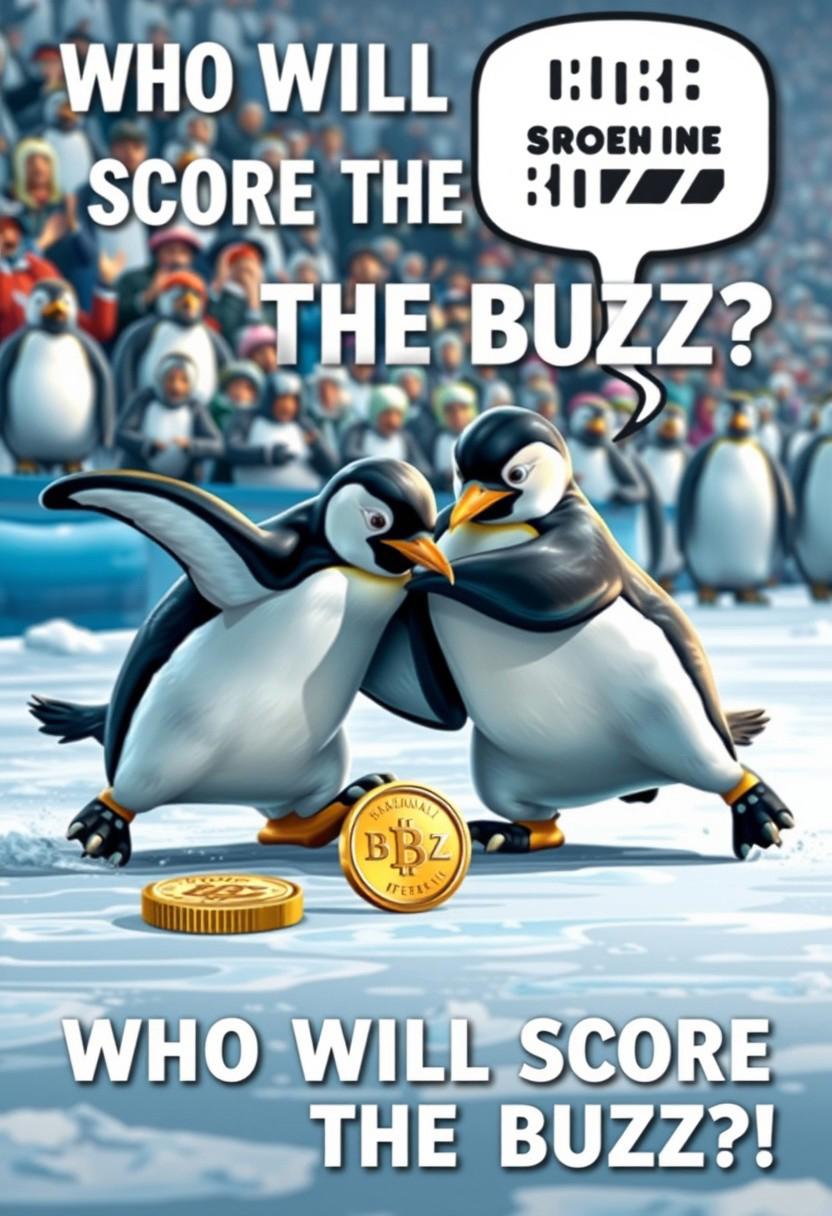 Penguin Battle on Ice – Two penguins in hockey gear are violently checking each other, both diving for a single BUZZ coin sliding across the ice. A crowd of penguins cheers as an announcer yells, "WHO WILL SCORE THE BUZZ?!"