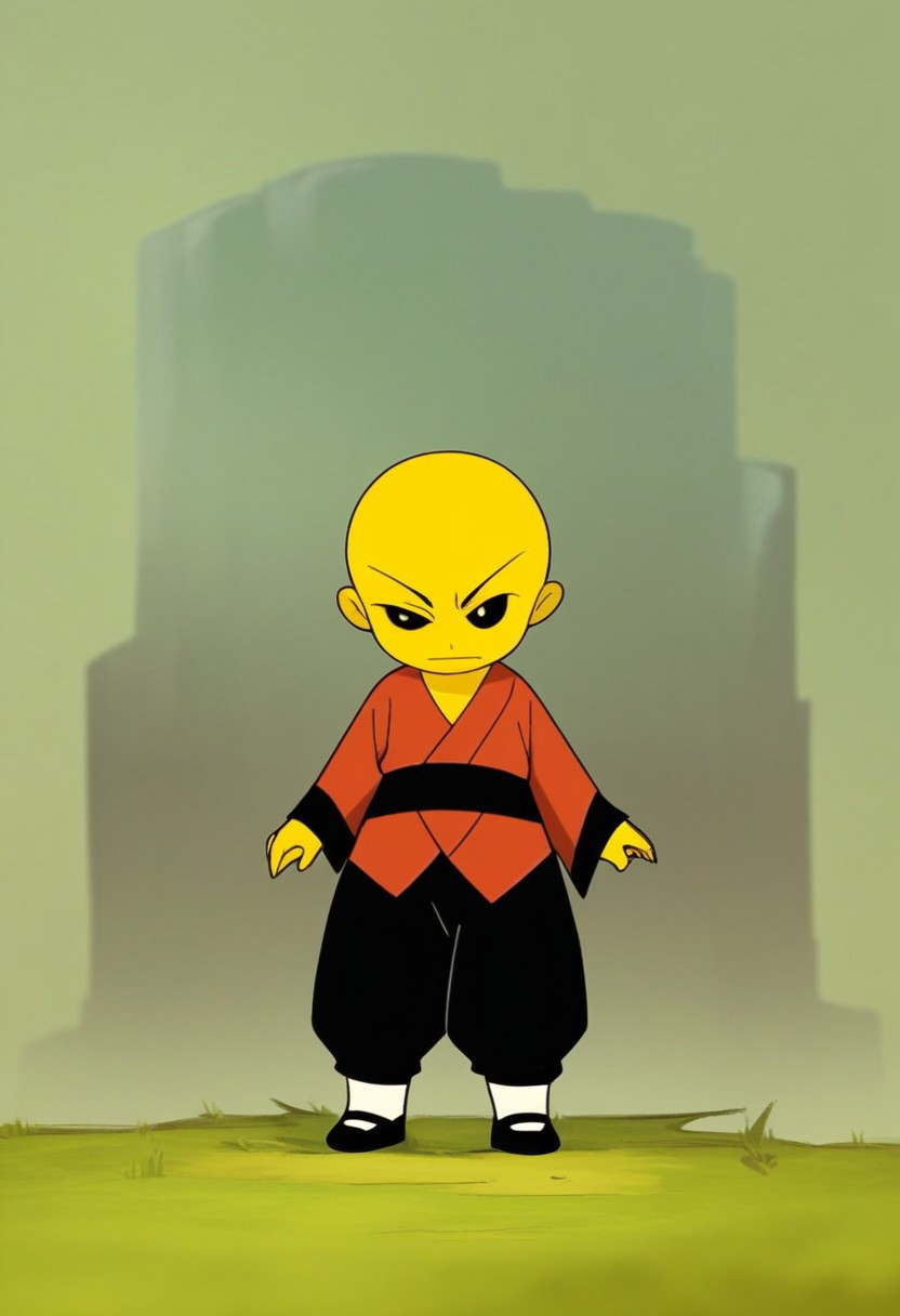 SatohKatohStyle, score_9, score_8_up, score_7_up, 1boy, solo, XiaolinOmi, 1boy, solo, male focus, Big round head, black eyes, no sclera, thin eyebrown, chibi proportions, round ear, yellow skin, red kimono, black pants, black sash, white socks, black shoes