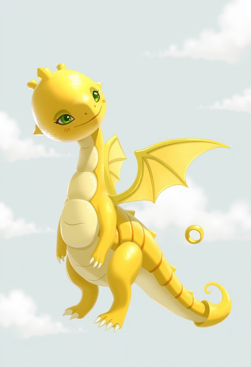 A stylized lemon dragon with a big lemon head and tiny wings tilts its head and looks this way. Its body is made of several connected lemon slices, and the tip of its tail has a curled lemon peel. Its eyes are a bit far apart, giving it a laid-back expression. The background is a pale blue sky with white clouds. wl_lemons