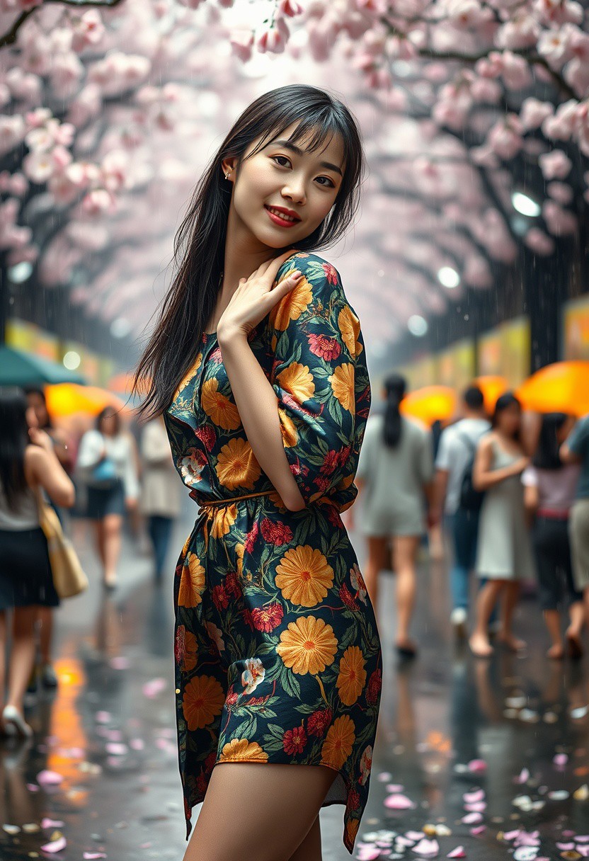 A young Japanese woman with pale skin stands in a vibrant Sakura festival, her dynamic pose accentuated by the rain. She wears a wet, colourful patterned shirt dress that clings to her body, highlighting her perfect anatomy. Her expression is playful and sensual as she touches her own body, surrounded by bouncing water droplets and sakura petals. The background is filled with joyful people, and natural lighting creates a soft, pastel-coloured atmosphere. The scene is framed with high-quality, sharp focus, and vivid details, capturing the beauty and perfection of the moment. Inspired by Wes Anderson's visual style, the lighting setup includes soft, diffused natural light with a slight overcast, enhancing the pastel tones and adding a playful, dreamy quality to the image. The film grain is subtle, and the colour grading is warm and inviting, evoking a sense of joy and celebration. Stable_Yogis_PDXL_Positives, Lunatic_Portrait, ,ArsMovieStill, colorful, vibrant colors, obsidian flowers, cross_necklace, photorealistic, natural skin texture, fine pores, realistic skin, intricate skin details, skin dentation, veins, pale white skin, detailed background , seductive pose, aurora, ultrarealistic, backlit, wearing a glowing colorful mad-mtrx bridal lingerie, LORAS\STYLE\Glowing_Glitch_SDXL:0.7000000000000001>, <lora:MORE LORAS\Realism_Lora_By_Stable_Yogi_Pony_V1.:0.5>, <lora:MORE LORAS\STYLE\Lunatic_Portrait:0.5>, <lora:MORE LORAS\STYLE\GothicDarkFantasyMovieSDXL:0.5>