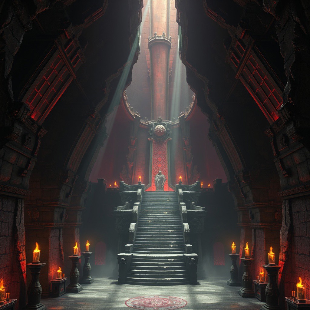 A liminal space within Ganon’s Tower from The Legend of Zelda: Ocarina of Time—a colossal fortress where time and reality feel fractured. The stone walls, blackened and cracked, pulse faintly with an eerie, reddish glow, as if something ancient and malevolent breathes within them. The vast halls stretch endlessly, their architecture impossibly twisted, leading into dark voids where the eye cannot pierce. A deep, low hum vibrates through the air, neither mechanical nor alive, an oppressive sound that never ceases. The flickering torches cast elongated, unnatural shadows, twisting unnervingly as if they move of their own will. The grand staircases ascend into darkness, the air thick with the scent of smoke, iron, and something older—something watching, waiting. Though the castle is abandoned, the presence of its master lingers in every corner. The throne room stands at the summit, shrouded in unnatural silence. The space between the walls feels too wide, too empty, yet suffocating. This is not just a fortress—it is a prison of power, a void where reality bends, a place that exists only to mark the end of all things.