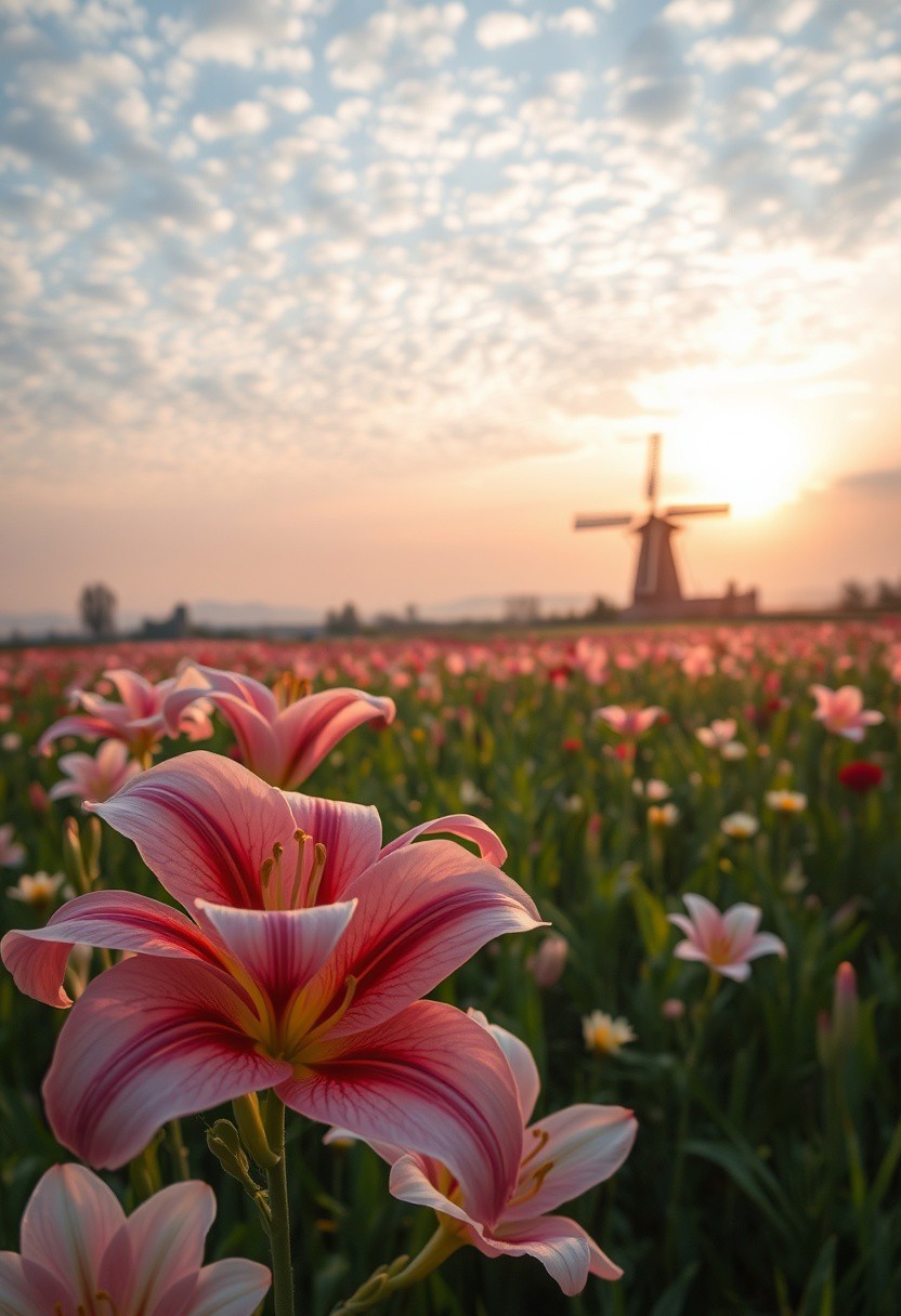 detailed background, from above,( Calm spring morning landscape), beautiful view, Flower Field, lily flower in full bloom, lily flower, early morning, sunrise sky, beautiful clouds, dappled sunlight, I can see a windmill in the distance, depth of field, masterpiece, best quality, ultra-detailed, very aesthetic, illustration, perfect composition, intricate details, absurdres, moody lighting, wisps of light, no humans,
