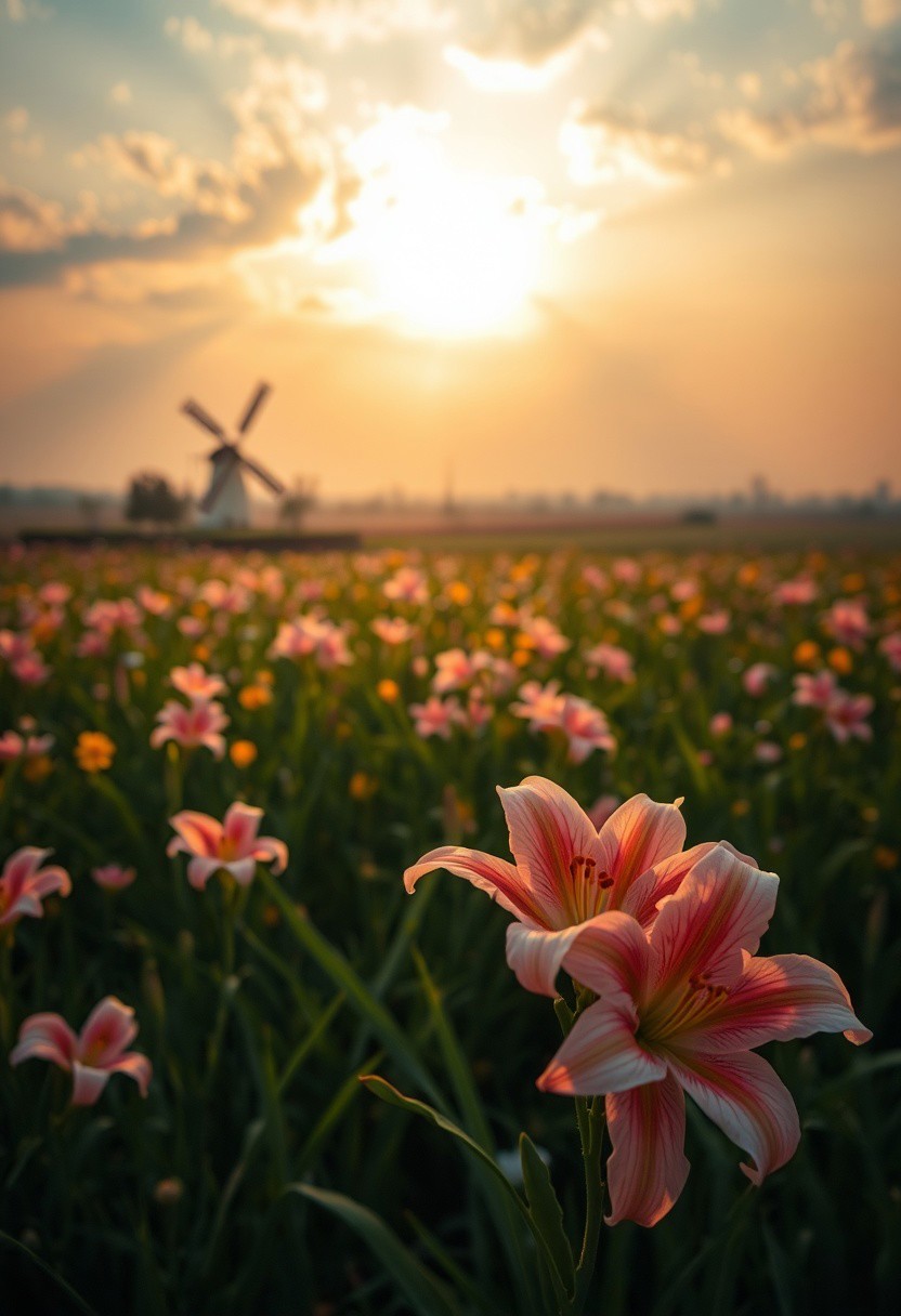 detailed background, from above,( Calm spring morning landscape), beautiful view, Flower Field, lily flower in full bloom, lily flower, early morning, sunrise sky, beautiful clouds, dappled sunlight, I can see a windmill in the distance, depth of field, masterpiece, best quality, ultra-detailed, very aesthetic, illustration, perfect composition, intricate details, absurdres, moody lighting, wisps of light, no humans,