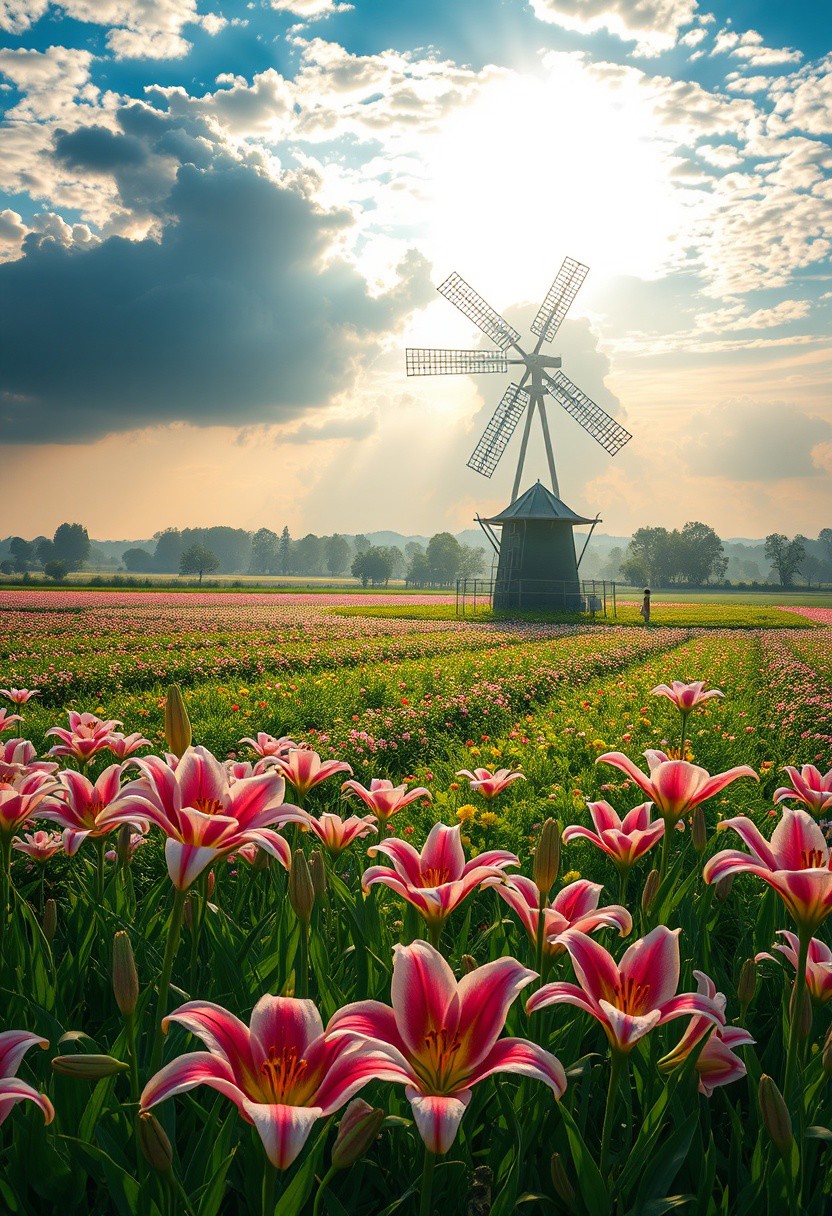 detailed background, from above,( Calm spring morning landscape), beautiful view, Flower Field, lily flower in full bloom, lily flower, early morning, sunrise sky, beautiful clouds, dappled sunlight, I can see a windmill in the distance, depth of field, masterpiece, best quality, ultra-detailed, very aesthetic, illustration, perfect composition, intricate details, absurdres, moody lighting, wisps of light, no humans,