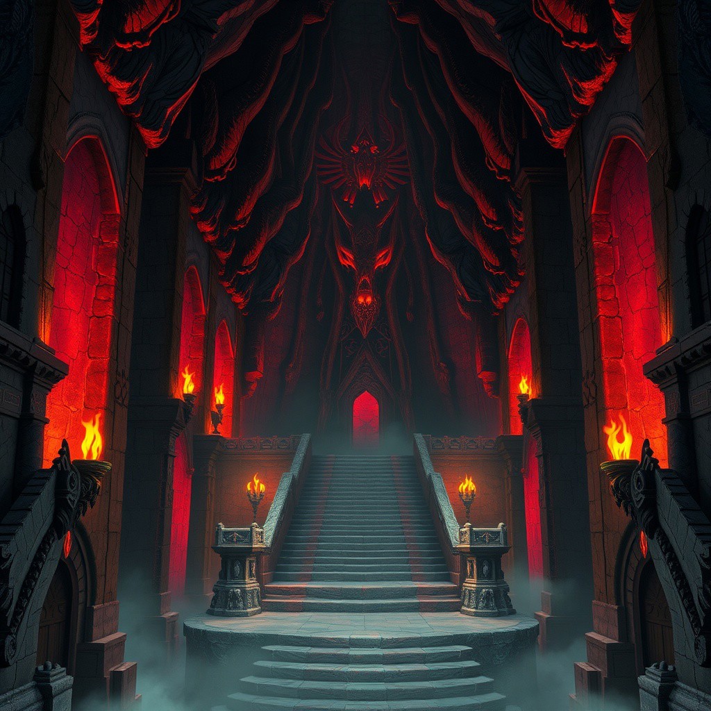 A liminal space within Ganon’s Tower from The Legend of Zelda: Ocarina of Time—a colossal fortress where time and reality feel fractured. The stone walls, blackened and cracked, pulse faintly with an eerie, reddish glow, as if something ancient and malevolent breathes within them. The vast halls stretch endlessly, their architecture impossibly twisted, leading into dark voids where the eye cannot pierce. A deep, low hum vibrates through the air, neither mechanical nor alive, an oppressive sound that never ceases. The flickering torches cast elongated, unnatural shadows, twisting unnervingly as if they move of their own will. The grand staircases ascend into darkness, the air thick with the scent of smoke, iron, and something older—something watching, waiting. Though the castle is abandoned, the presence of its master lingers in every corner. The throne room stands at the summit, shrouded in unnatural silence. The space between the walls feels too wide, too empty, yet suffocating. This is not just a fortress—it is a prison of power, a void where reality bends, a place that exists only to mark the end of all things.