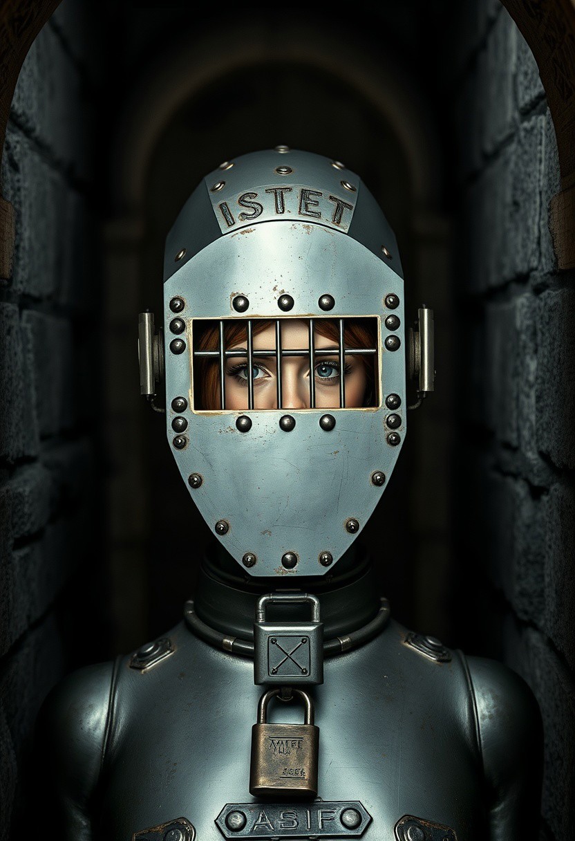 A perfectly smooth tightly-fitting bdsm steel casing covered with rivets in the approximate form of a rigid standing woman with a heavy restraint collar and with a barred horizontal eye slit on the front of the head (and a padlocked hinged door closing over the mouth:1.4) ( a woman is trapped inside looking out through the barred eye slit:1.8), in a castle dungeon