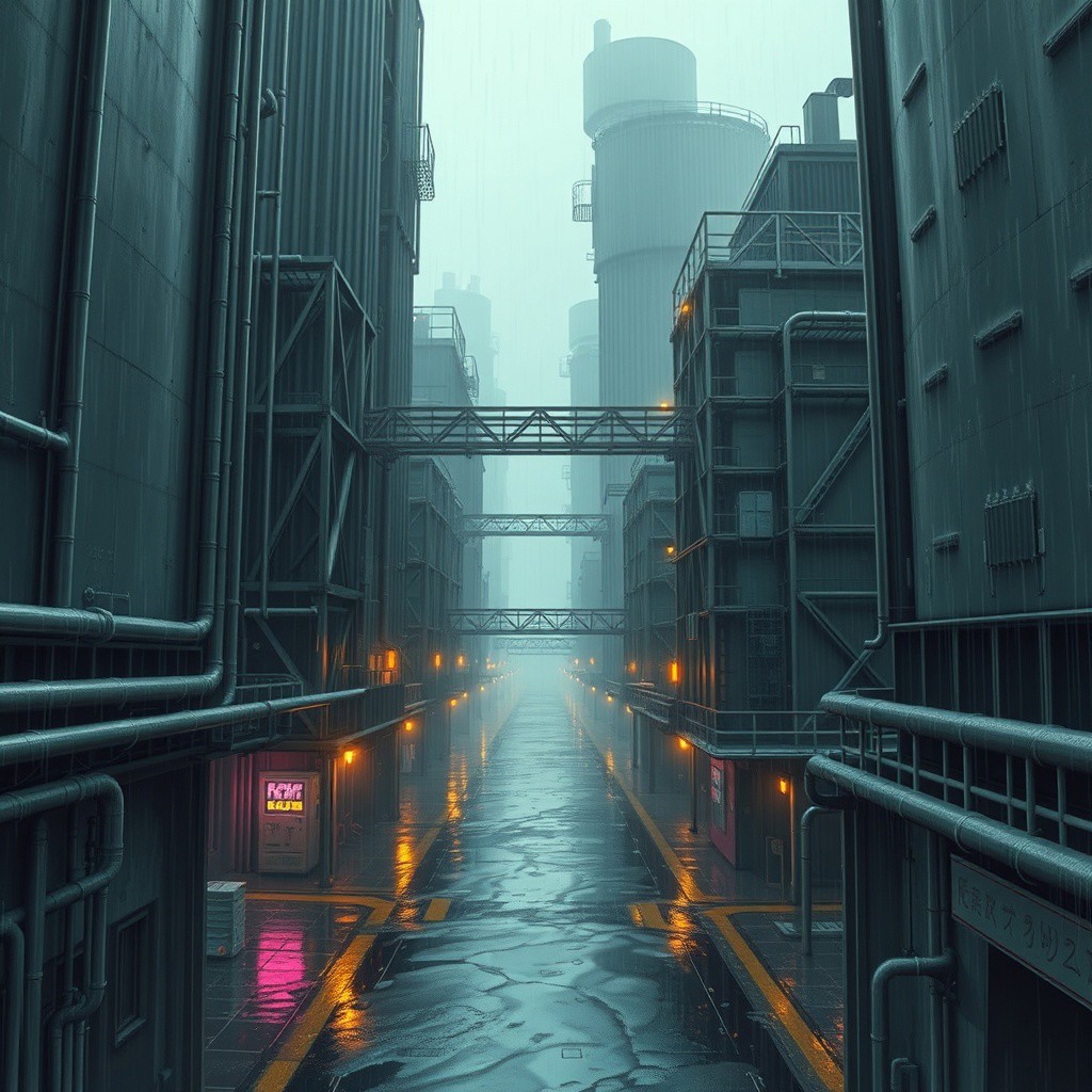 A liminal space in Amegakure, the Hidden Rain Village, exactly as seen in Naruto. Towering metal buildings rise into the misty sky, their surfaces slick with constant rainfall. The narrow streets are lined with pipes, walkways, and industrial structures, all soaked in a never-ending drizzle. Neon lights flicker faintly, reflecting in the puddles that cover the ground. The village is completely empty—no people, no movement, only the sound of raindrops echoing through the deserted alleys. The metal bridges connecting the high-rise structures stretch into the distance, disappearing into the fog. The air is thick with humidity, and the usual bustling presence of shinobi is gone. The city feels suspended in time, its mechanical heart still beating, but with no one left to witness it. The rain continues to fall, endlessly, over a village lost in solitude.