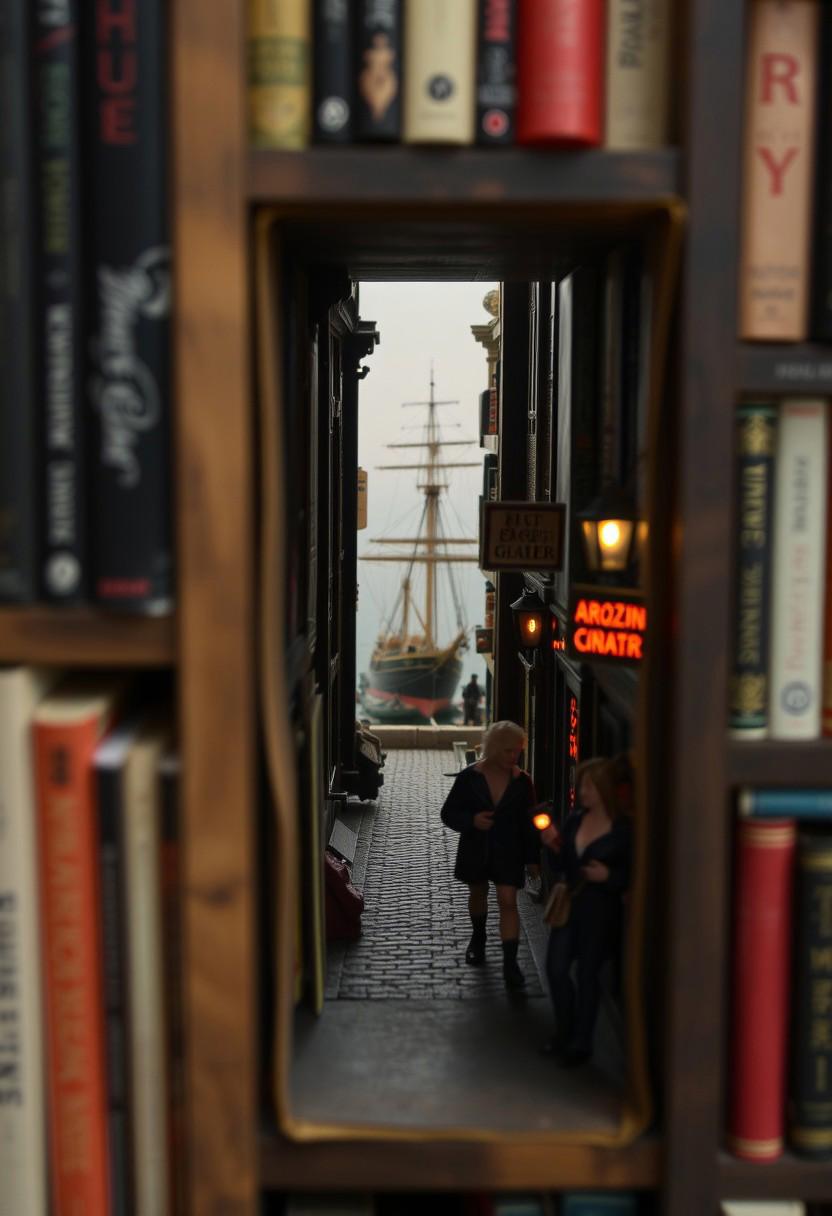 A bookshelf of erotica with a missing book. The gap created by the missing book is the entrance to a miniature red light district street that leads to a distant miniature quayside at which a small ship is unloading. Drunken sailors are carousing with the prostitutes in the street