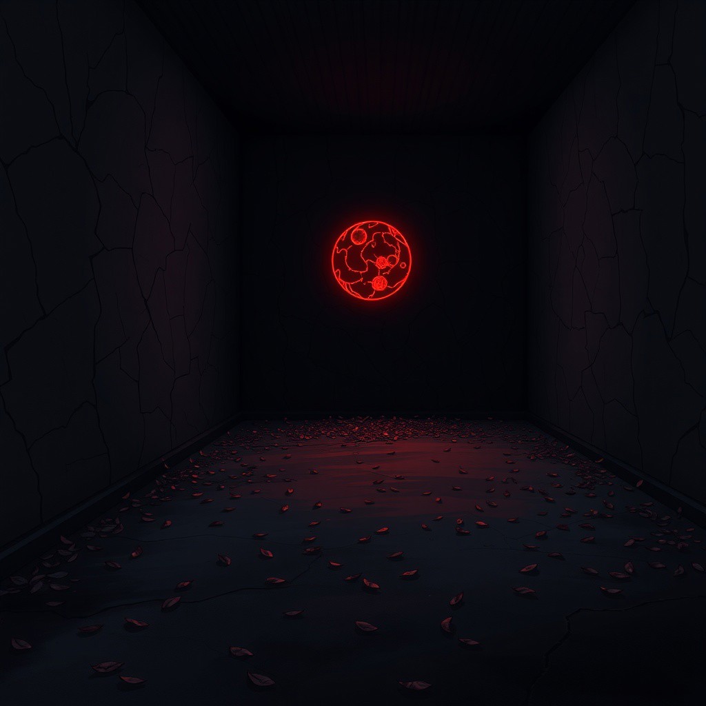A liminal space inspired by Itachi Uchiha from Naruto. The environment is dark, quiet, and emotionally heavy, filled with an air of intense solitude and sorrow. The setting is a dimly lit, abandoned landscape—perhaps a lone, secluded room or a desolate forest at dusk. The walls are cracked, and the ground is covered with fallen leaves, giving the scene an eerie, forsaken feel. The haunting red glow of Itachi’s Sharingan subtly illuminates the scene, casting long, sharp shadows and adding a sense of tension to the atmosphere. There are no people, only remnants of past battles or memories. The place feels frozen in time, like a space where Itachi’s presence lingers, silent and unyielding. His connection to this space, filled with loss, pain, and regret, hangs in the air, creating a chilling, melancholic energy. The environment is both beautiful and heartbreaking, reflecting Itachi’s internal struggle and isolation.