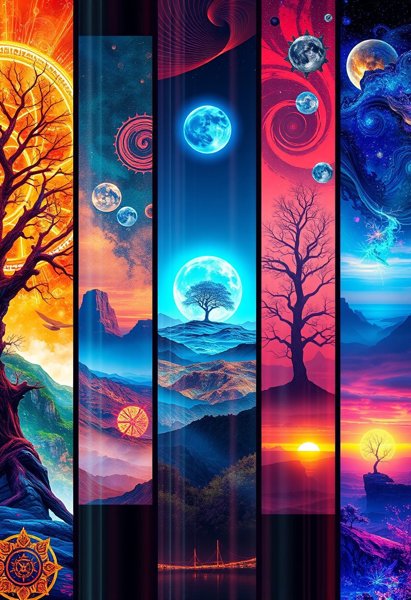A digital cyberpunk art splash in the style of bo-cyborgsplash, a vibrant and mystical landscape depicted in a series of vertical banners, each featuring a different color palette, the first banner on the left shows a glowing tree with intricate patterns, the second banner features a swirling orange and red design, the third banner features an abstract landscape with a tree in the center, the fourth banner showcases a glowing blue planet in the sky, the fifth banner showcases an otherworldly landscape with distant mountains, the sixth panel showcases a distant landscape with trees and distant structures, the seventh panel showcases an ocean scene, the eighth panel features a mystical tree with vibrant colors, the ninth panel displays a stunning sunset landscape, the final panel features an ethereal landscape with glowing elements, the overall effect is a mesmerizing and captivating image that exudes a sense of otherworldly beauty<lora:boFLUX Cyborgsplash.safetensors:1.0:1.0>