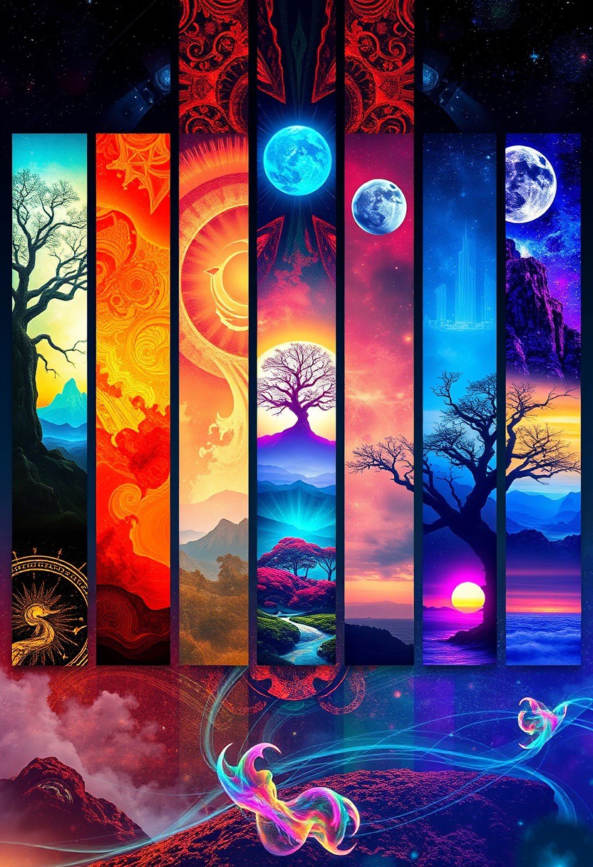 A digital cyberpunk art splash in the style of bo-cyborgsplash, a vibrant and mystical landscape depicted in a series of vertical banners, each featuring a different color palette, the first banner on the left shows a glowing tree with intricate patterns, the second banner features a swirling orange and red design, the third banner features an abstract landscape with a tree in the center, the fourth banner showcases a glowing blue planet in the sky, the fifth banner showcases an otherworldly landscape with distant mountains, the sixth panel showcases a distant landscape with trees and distant structures, the seventh panel showcases an ocean scene, the eighth panel features a mystical tree with vibrant colors, the ninth panel displays a stunning sunset landscape, the final panel features an ethereal landscape with glowing elements, the overall effect is a mesmerizing and captivating image that exudes a sense of otherworldly beauty<lora:boFLUX Cyborgsplash.safetensors:1.0:1.0>