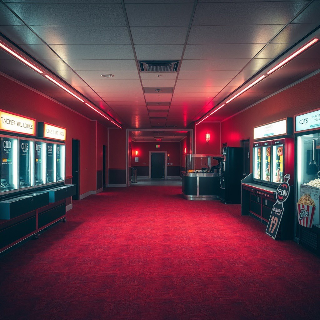 A liminal space inside the lobby of an empty movie theater, frozen in time. The dim neon lights cast a soft, buzzing glow over the faded red carpet, patterned with geometric designs worn down by decades of footsteps. The scent of stale popcorn and artificial butter lingers in the air, mixing with the faint hum of the soda machines, still running despite the absence of customers. Rows of vacant ticket kiosks stand silent, their glass windows reflecting the flickering glow of the old marquee above. The concession stand, once bustling with life, is now eerily still—popcorn bags stacked neatly, soda dispensers blinking idly, a lone cash register left slightly open. Cardboard cutouts of long-past movie releases stand in the corners, their smiling faces and bold taglines frozen in a moment that no longer exists. A hallway leading to the darkened auditoriums looms in the distance, its entrance swallowed in shadow. The only sound is the distant crackle of an unattended speaker, playing the looping jingle of the theater chain’s advertisement. This place feels like a memory you can’t place, an in-between moment where time has stalled—an echo of countless nights spent here, but now, you're alone.