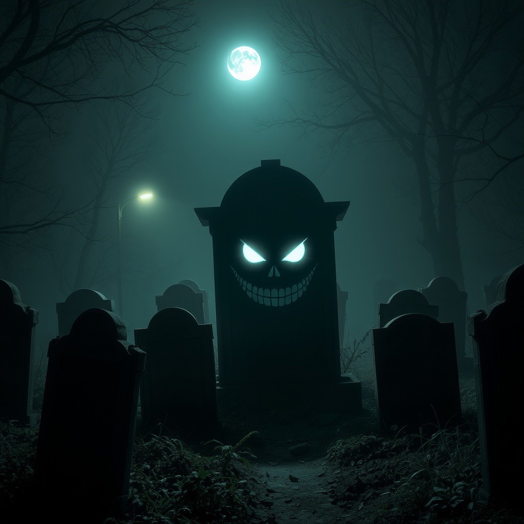 A deserted cemetery at night, swallowed by fog and moonlight. The old, cracked tombstones stand crooked, forgotten, as the cold air carries a whisper of something unseen. The dim glow of a distant streetlamp barely reaches the overgrown paths, leaving most of the graveyard in absolute darkness. And then, in the deepest shadow between the tombs, it waits. At first, you see nothing. But as your eyes adjust, two glowing white eyes slowly emerge from the void, locked onto you with an unnatural stillness. Below them, a wide, sinister grin—sharp, too large, floating in the darkness. The rest of its form is lost in the shadows, as if it never had one. It does not move. But you feel it. Watching. Smiling. Waiting. And the longer you stare… the closer it seems to get.